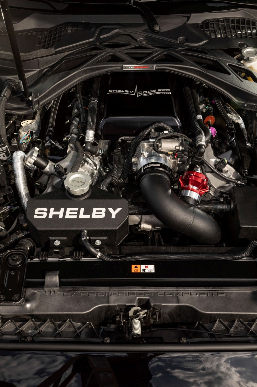 La inspiración del proyecto, así como la denominación Code Red, proviene de un GT500 experimental de 2008 cuyo V8 de 5.4 litros reemplazó sus supercargadores por una configuración biturbo. Esta es la misma fórmula que ha seguido Shelby con el actual GT500 y su mecánica V8 de 5.2 litros, capaz de entregar hasta 1.318 CV y 1.356 Nm si emplea combustible E85. Con gasolina de menor octanaje, la potencia se limita a 1.014 CV y 1.058 Nm de par.