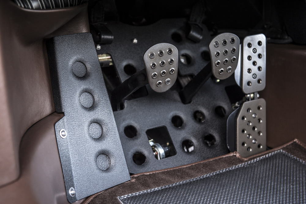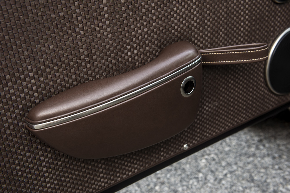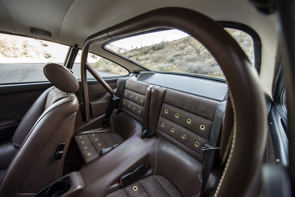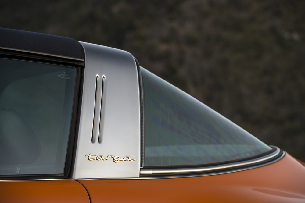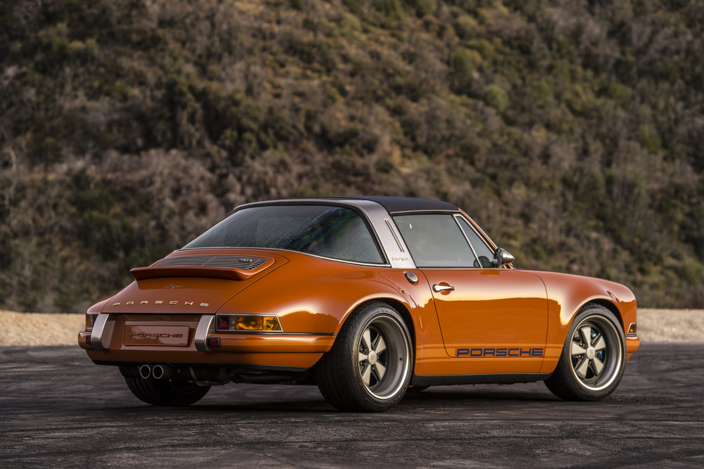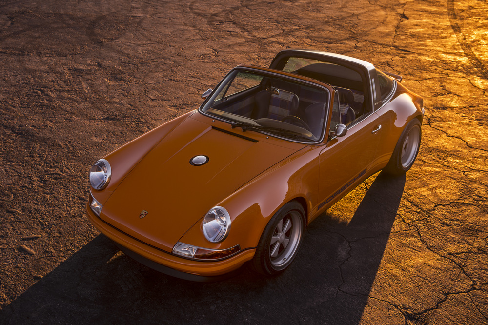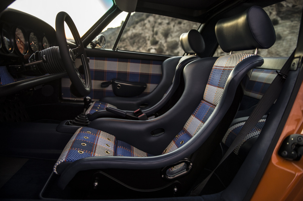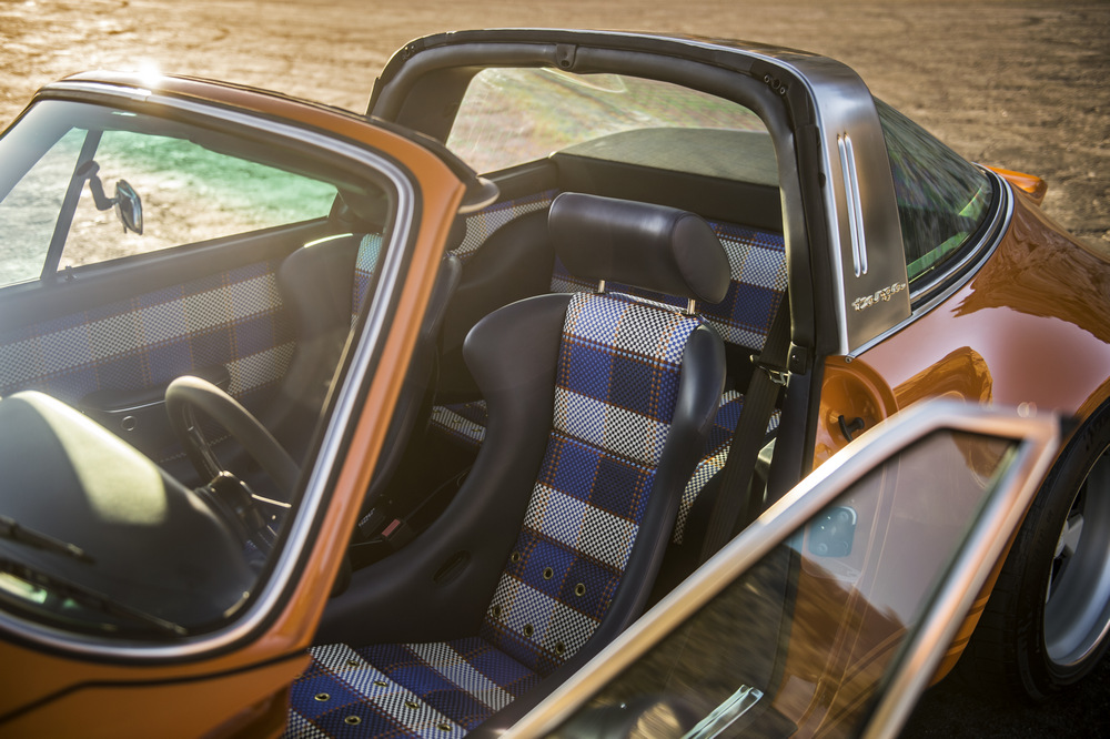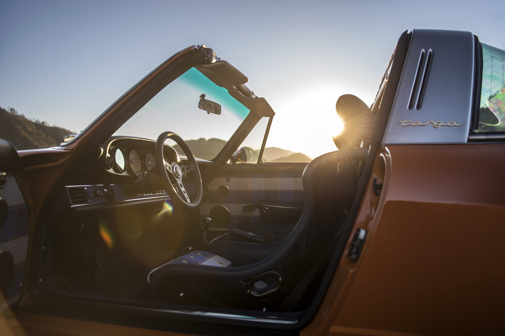 Empezamos por el nuevo Singer Porsche 911 Targa ‘Luxemburg’, construido sobre la base de un Porsche 911 con carrocería targa del año 1990. Este 964 está rematado en color Deep Orange y ha sido extensamente modificado. Su carrocería, como la del otro coche, está realizada por completo en fibra de carbono, incluso el techo targa desmontable está construido con este caro y ligero material. En el habitáculo, luce una de las terminaciones más vistosas que hemos visto, con un tapizado especial, llamado Tyler Tartan, que incluye siete cueros de color con patrones diferentes. Bajo el capó equipa un bloque 4.0 atmosférico de seis cilindros opuestos capaz de sobrepasar las 7.200 vueltas y de entregar 390 CV de potencia, una mecánica que ha sido desarrollada por Cosworth.