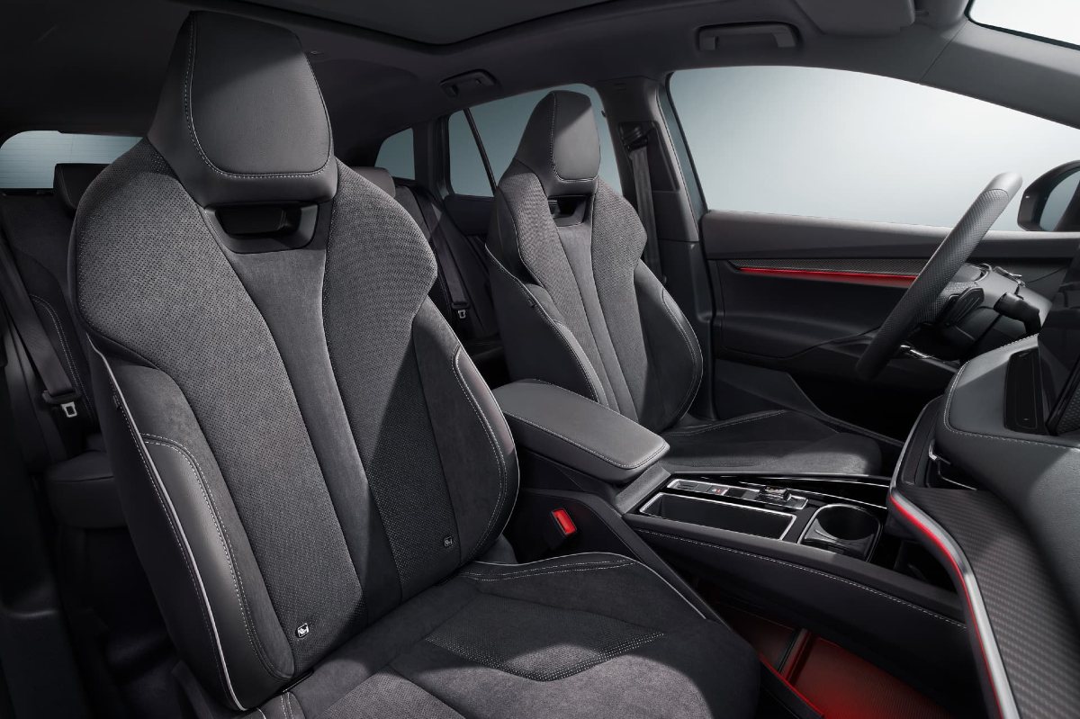 El tono oscuro sigue estando presente en el habitáculo ya que, salvo por la iluminación ambiental, tanto el cuero sintético del salpicadero, como los paneles de las puertas y la tapicería de los asientos deportivos con reposacabezas integrados son de color negro. Solo está presente el gris en las costuras de contraste y también hace aparición un símil de fibra de carbono en algunas molduras.
