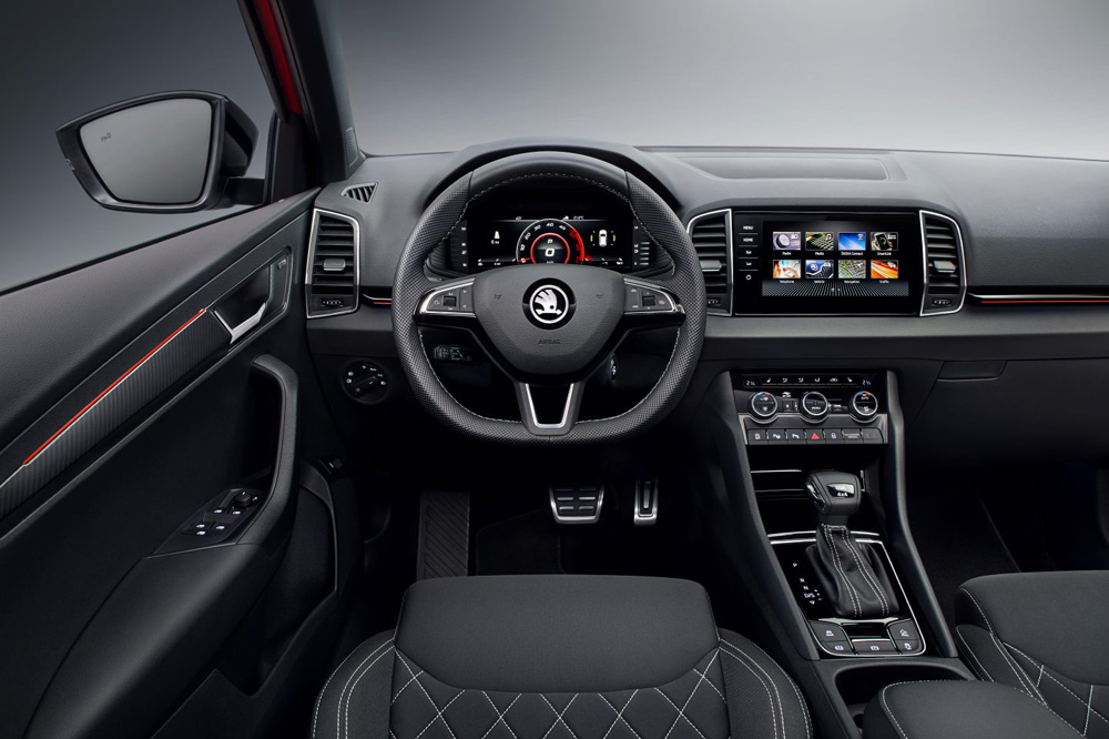 Como su primo español, el SEAT Arona (prueba), el Skoda Karoq Sportline puede equipar un cuadro de mandos digital que para diferenciarse del resto de la gama, incluye un quinto modo adicional de visualización con el tacómetro y el velocímetro en el centro. En el habitáculo también encontramos unos asientos con un diseño más deportivo y con un tapizado Thermoflux específico, rematado en negro y con costuras en plata a modo de contraste.