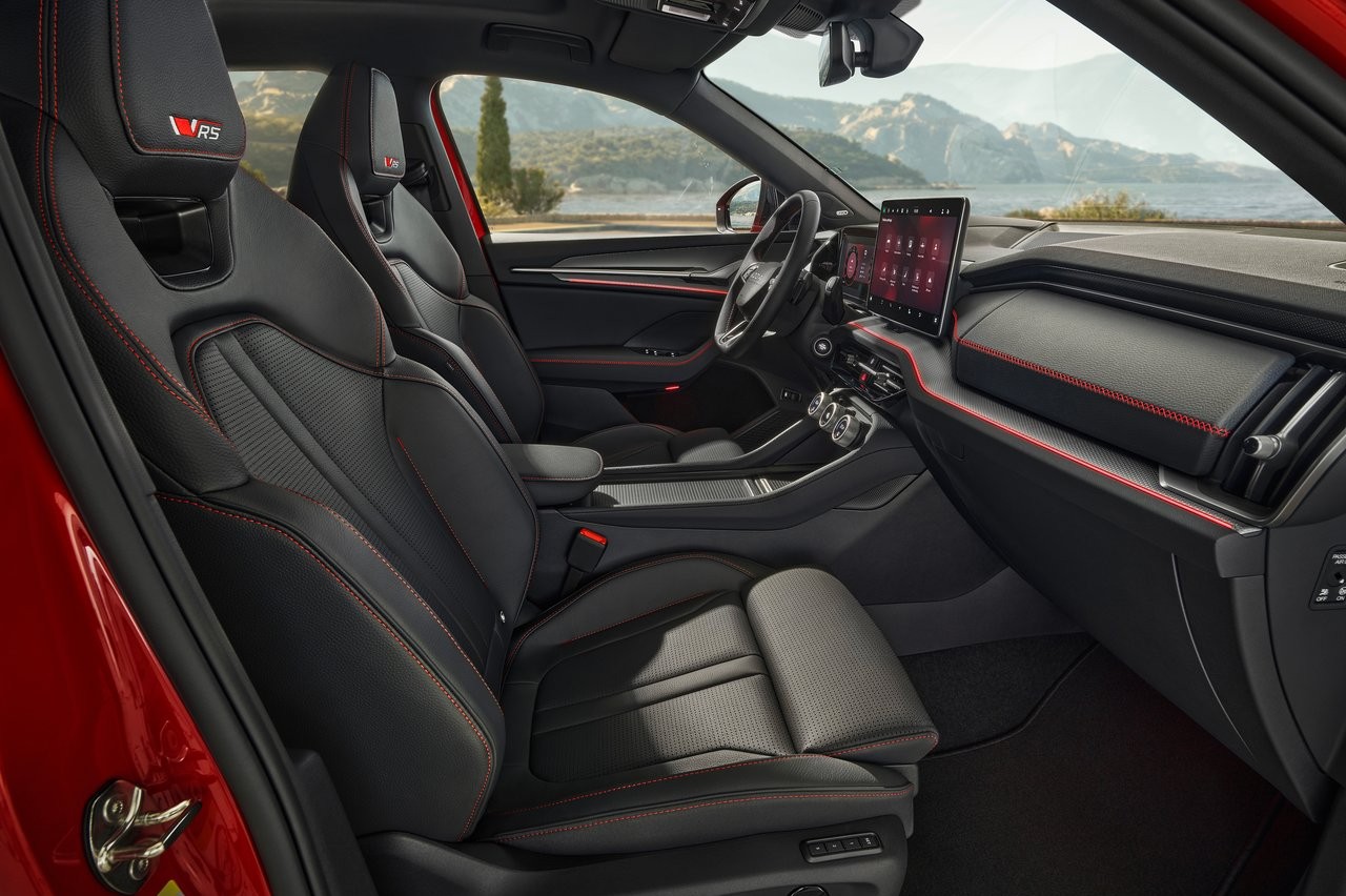 El interior se puede configurar con dos acabados que Skoda llama Lounge Design Selection y RS Suite Design Selection. Dependiendo del escogido, cambia el aspecto del habitáculo. El primero cuenta con una tapicería de piel artificial en los asientos con regulación eléctrica y función de memoria, un sistema de iluminación ambiental y calefacción en los asientos posteriores, entre otros elementos, mientras que el segundo tiene piel auténtica en algunas partes de los asientos, que además son ventilados, y molduras específicas.