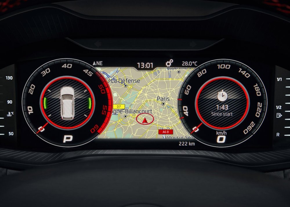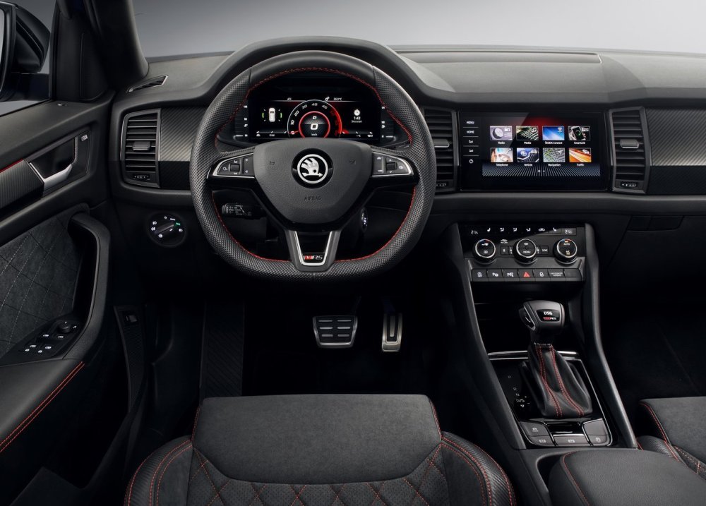 El interior también combina espacio, deportividad y confort. Los asientos están terminados en Alcantara con costuras en contraste y se incluyen elementos terminados en fibra de carbono y el nuevo Virtual Cockpit rediseñado para disponer de pantallas específicas para los modos de conducción deportivos. El volante multifunción está terminado en Alcantara también y, de serie, se incluyen los umbrales de las puertas con el logotipo de Kodiaq y el paquete de iluminación ambiental LED.