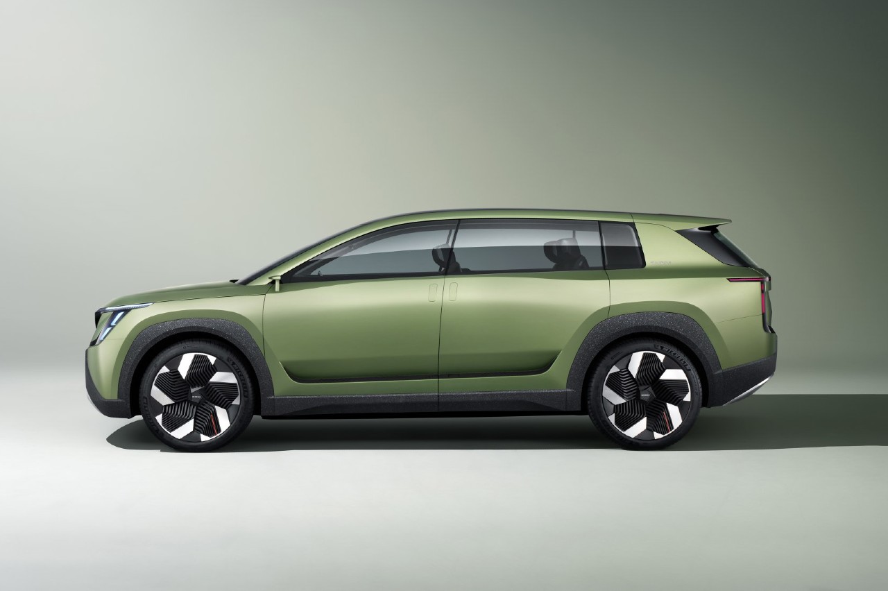 Destaca el paragolpes, con siete franjas verticales que son tomas de aire y tienen su réplica en el trasero. Las protecciones inferiores son voluminosas y cuentan con refuerzos metálicos en la zona central del morro y la zaga, calza llantas de 22 pulgadas, los retrovisores son particularmente compactos, prescinde de pilar B (las puertas traseras son de apertura suicida) y en la trasera asoma un pequeño alerón doble y los pilotos, también muy finos, tiene forma de ‘T’. Además, el color Explorer Green es el primer mate para un modelo de Skoda.