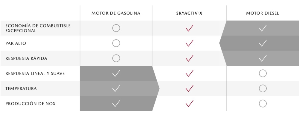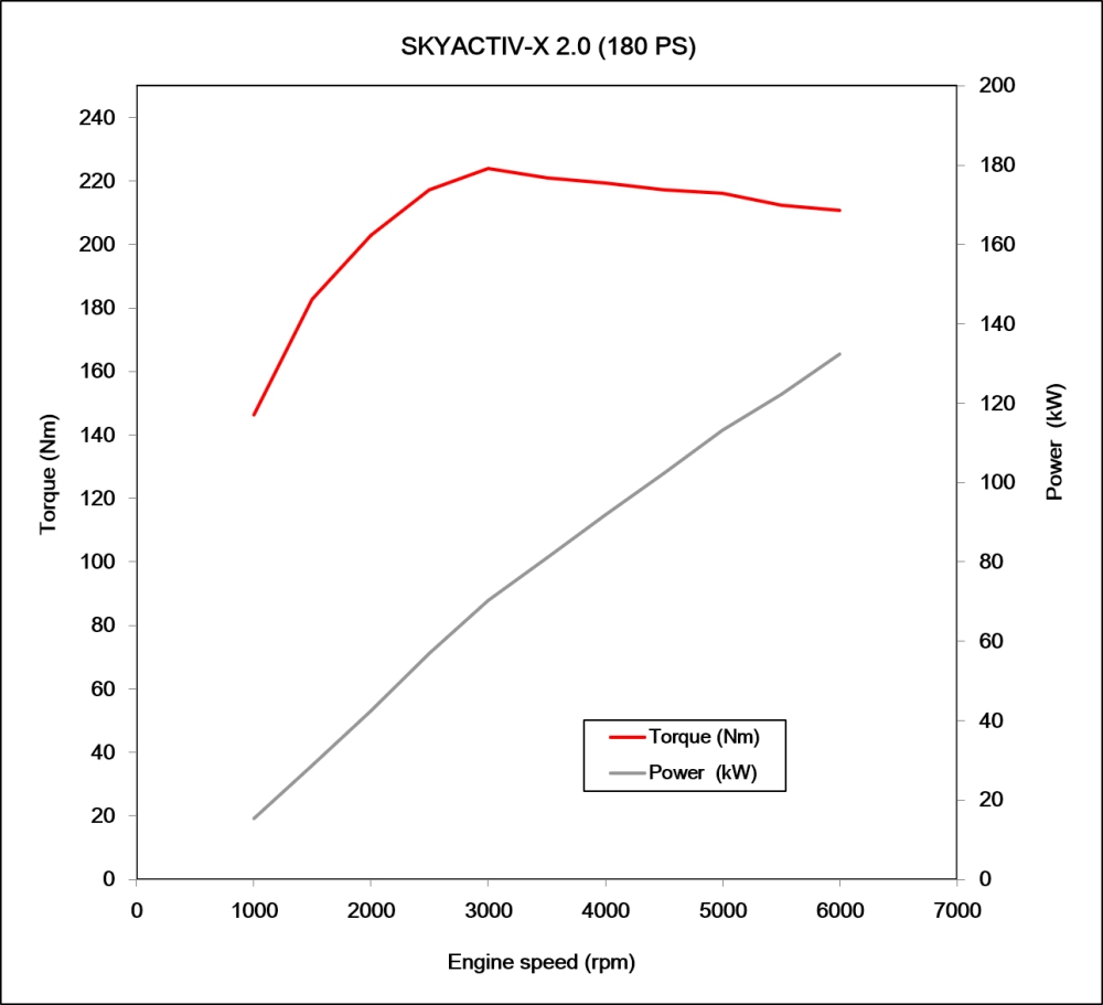 Mientras tanto, del diésel adopta su menor consumo de combustible, un par motor más elevado y una respuesta más rápida. El motor puede trabajar en modo SPCCI durante un porcentaje de tiempo más amplio, ya que actúa en un rango más grande de revoluciones, la entrega de par es un 10% más elevada que en el motor Skyactiv-G de 165 CV y el consumo es inferior.