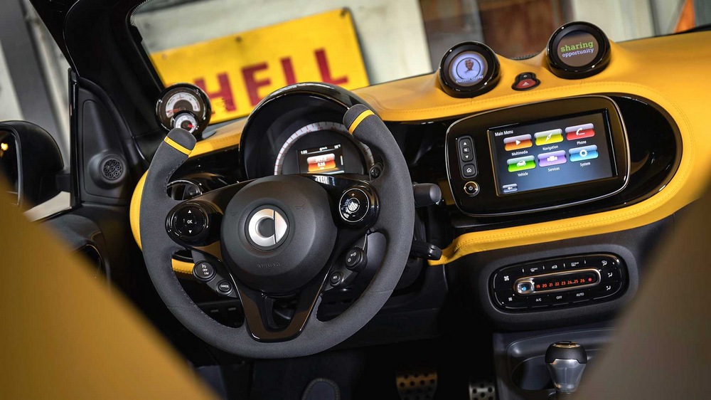 En el habitáculo, lo más destacado es la introducción de un nuevo volante recortado por su parte superior y la implementación de pequeñas pantallas ubicadas en pequeños soportes sobre el salpicadero por donde normalmente expulsa el aire el sistema de climatización. Y aunque no han revelado las especificaciones técnicas, sabemos que el smart forease+ Concept está construido sobre la base del smart fortwo cabrio electric drive, por lo que suponemos que dispondrá de un motor eléctrico de 80 CV y una batería de 17,6 kWh.