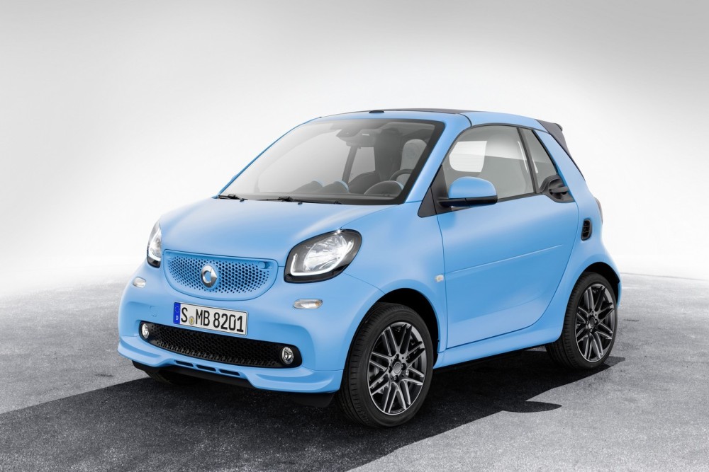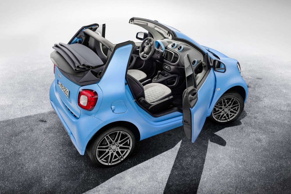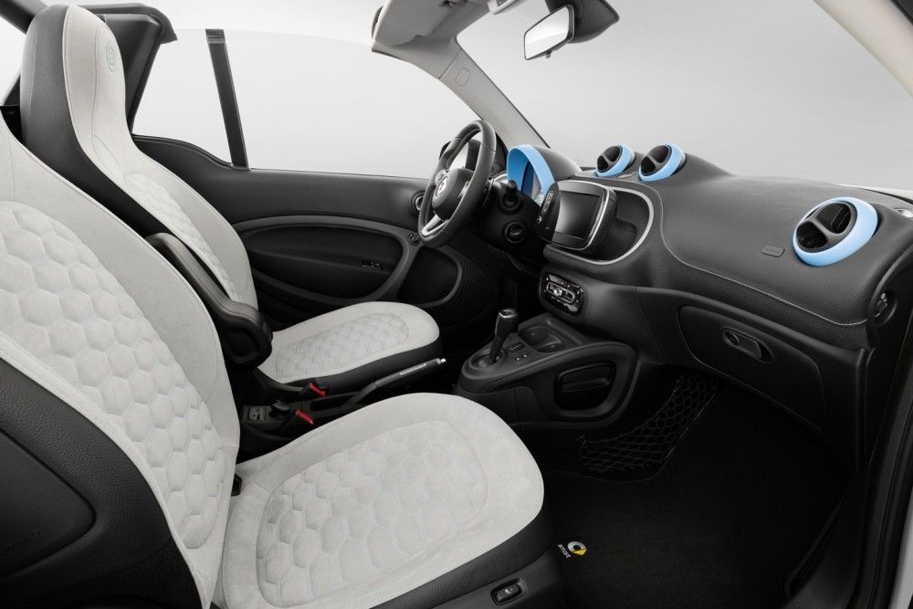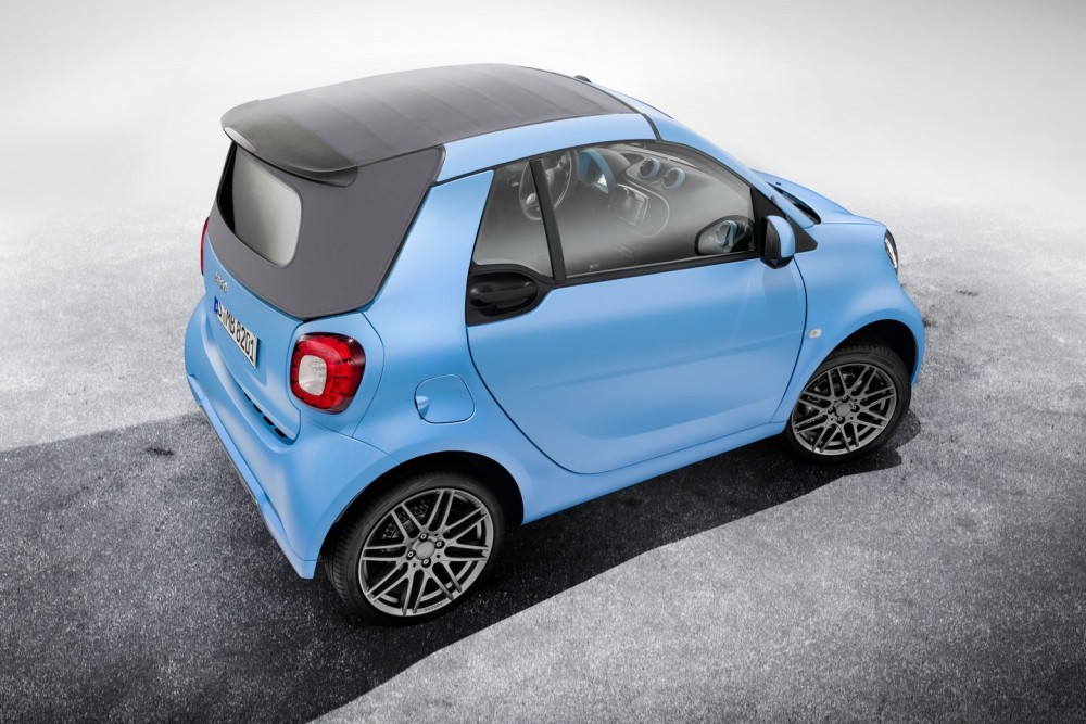 El exterior ha sido pintado en azul claro con terminación mate. La capota del Fortwo Cabrio Brabus es de color gris titanio, mientras que el interior gana un tema en negro y azul con tejido imitación piel y las superficies son suaves con un patrón de malla. El preparador alemán ha aplicado una terminación azul para las piezas de revestimiento, un color que también se muestra en los asientos y en los pespuntes del salpicadero.