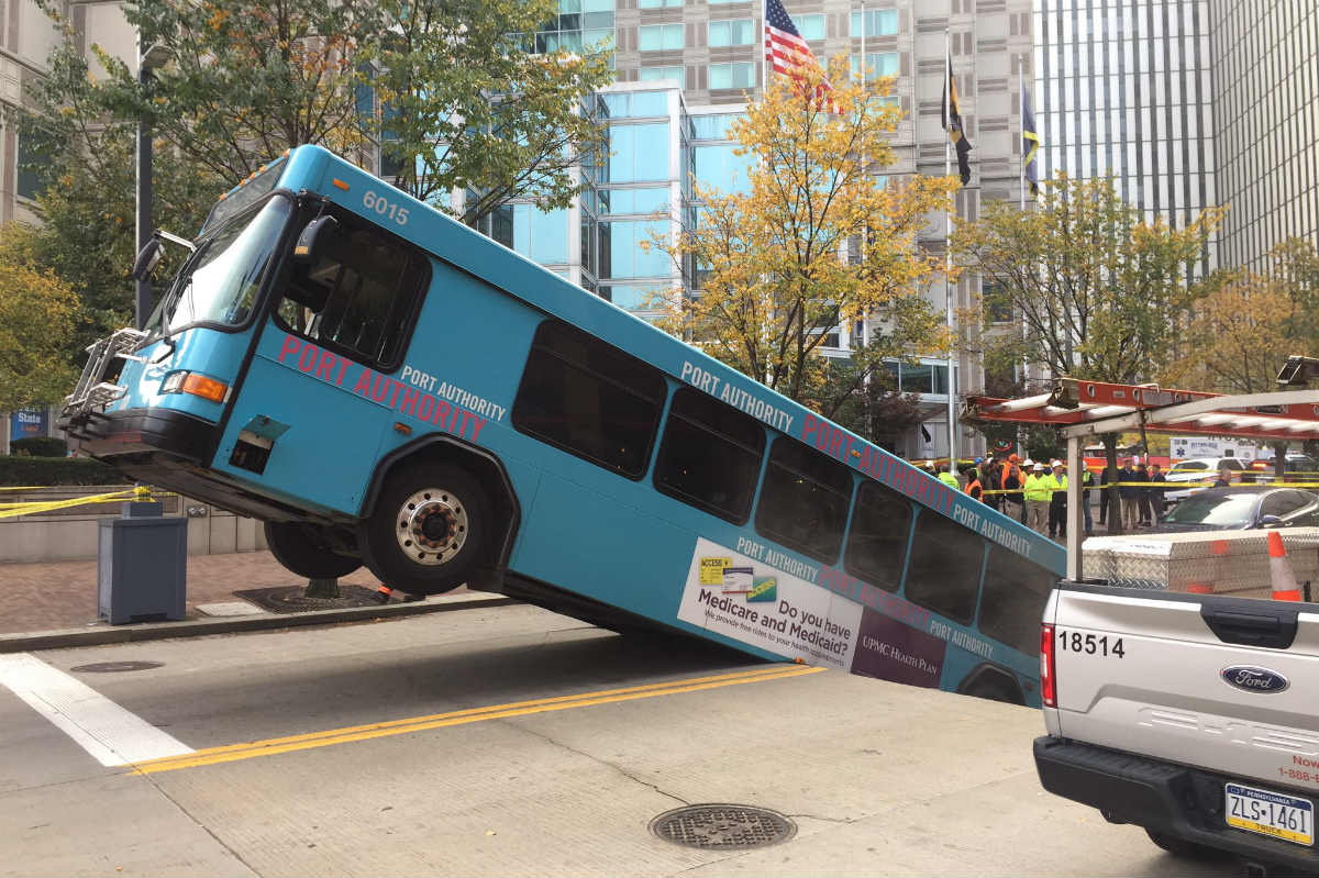 El incidente tuvo lugar alrededor de las 8 en el cruce entre Penne Avenue y 10th Street, cuando sin previo aviso se abrió un agujero en la calzada que se tragó toda la parte trasera del autobús y también afectando al morro de un Kia. El modelo, perteneciente a la compañía Port Authority, estaba parado en un semáforo en rojo cuando el asfalto se vino abajo, hundiéndose su zaga y dejando el frontal suspendido en el aire.
