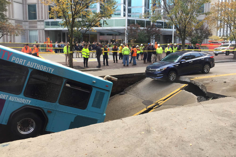 En Pittsburg, Pennsylvania (Estados Unidos) tuvieron un comienzo de semana un poco más duro y sobre todo raro de lo habitual: un enorme socavón se tragó un autobús de la línea urbana en plena hora punta de la mañana.