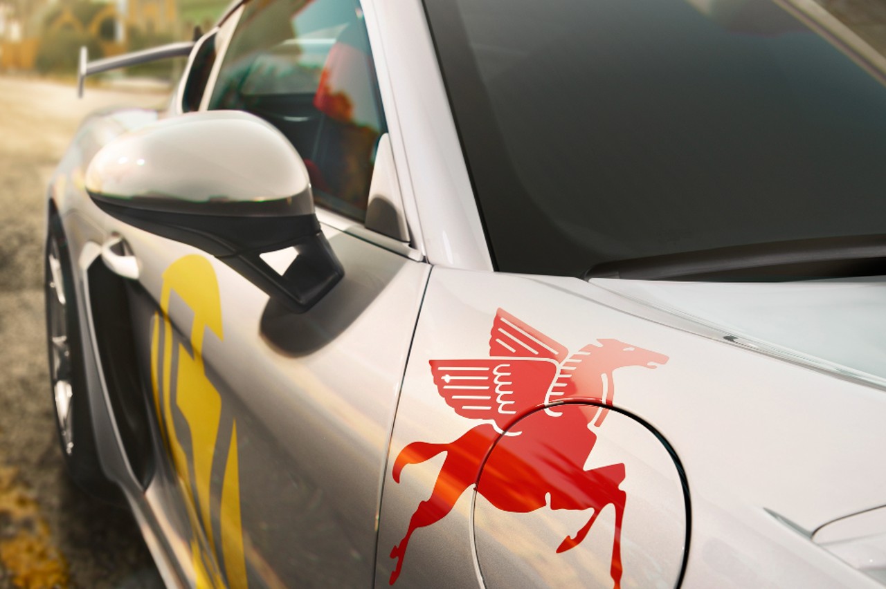En el centro del capó y en los laterales del alerón posterior vemos el logotipo TAG Heuer en un gris ligeramente más oscuro. Un motivo de Pegaso en el alerón delantero izquierdo (en el 152) y, alternativamente, en el paso de rueda trasero izquierdo (en el 154) nos recuerda que el 550 Spyder que corrió en la Panamericana fue uno de los primeros automóviles de carreras con patrocinadores. El caballo con alas formaba parte del logotipo de Mobil Oil.