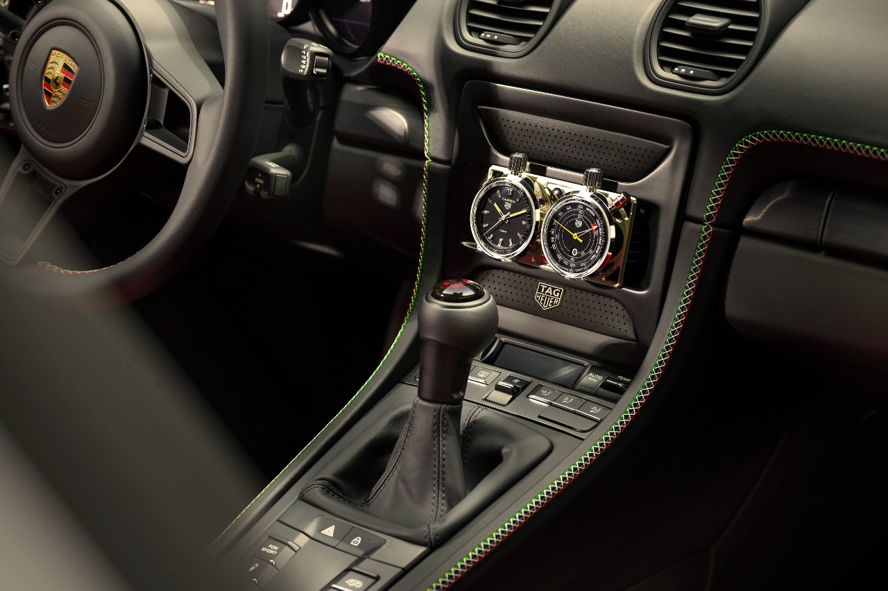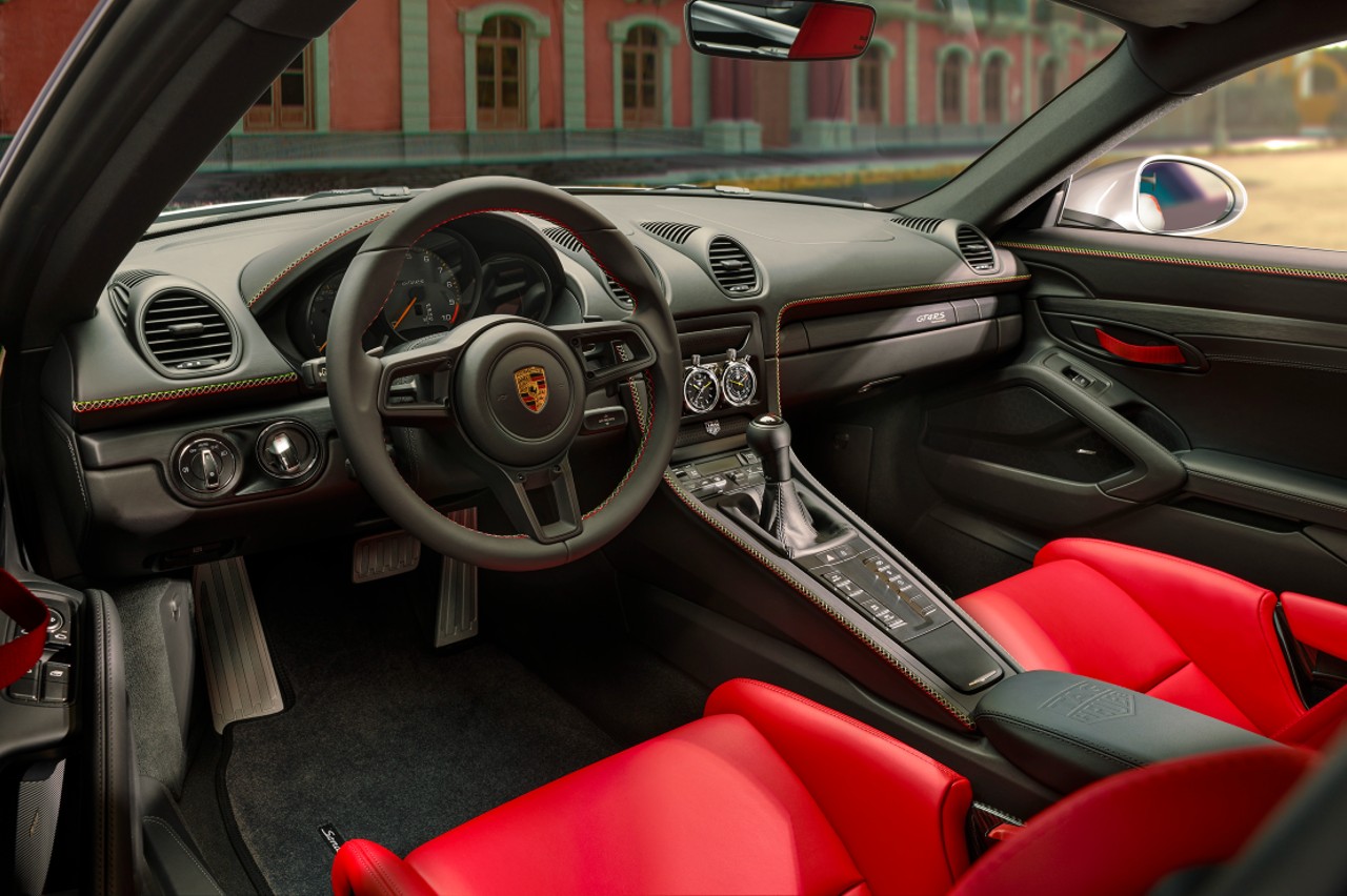 En el interior, el Porsche 718 Cayman GT4 RS Sonderwunsch luce una combinación en negro y Rojo Guardia, con acabados en aluminio anodizado de color negro. El detalle distintivo lo conforma el bordado en cruz tricolor con los colores de la bandera mexicana y el logotipo de TAG Heuer. Este pespunte verde, blanco y rojo puede verse, por ejemplo, en el aro del volante y en el tablero de instrumentos.