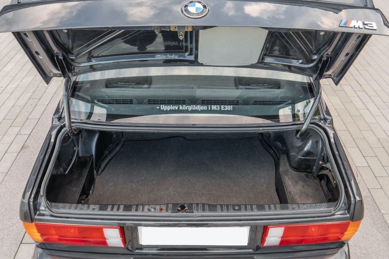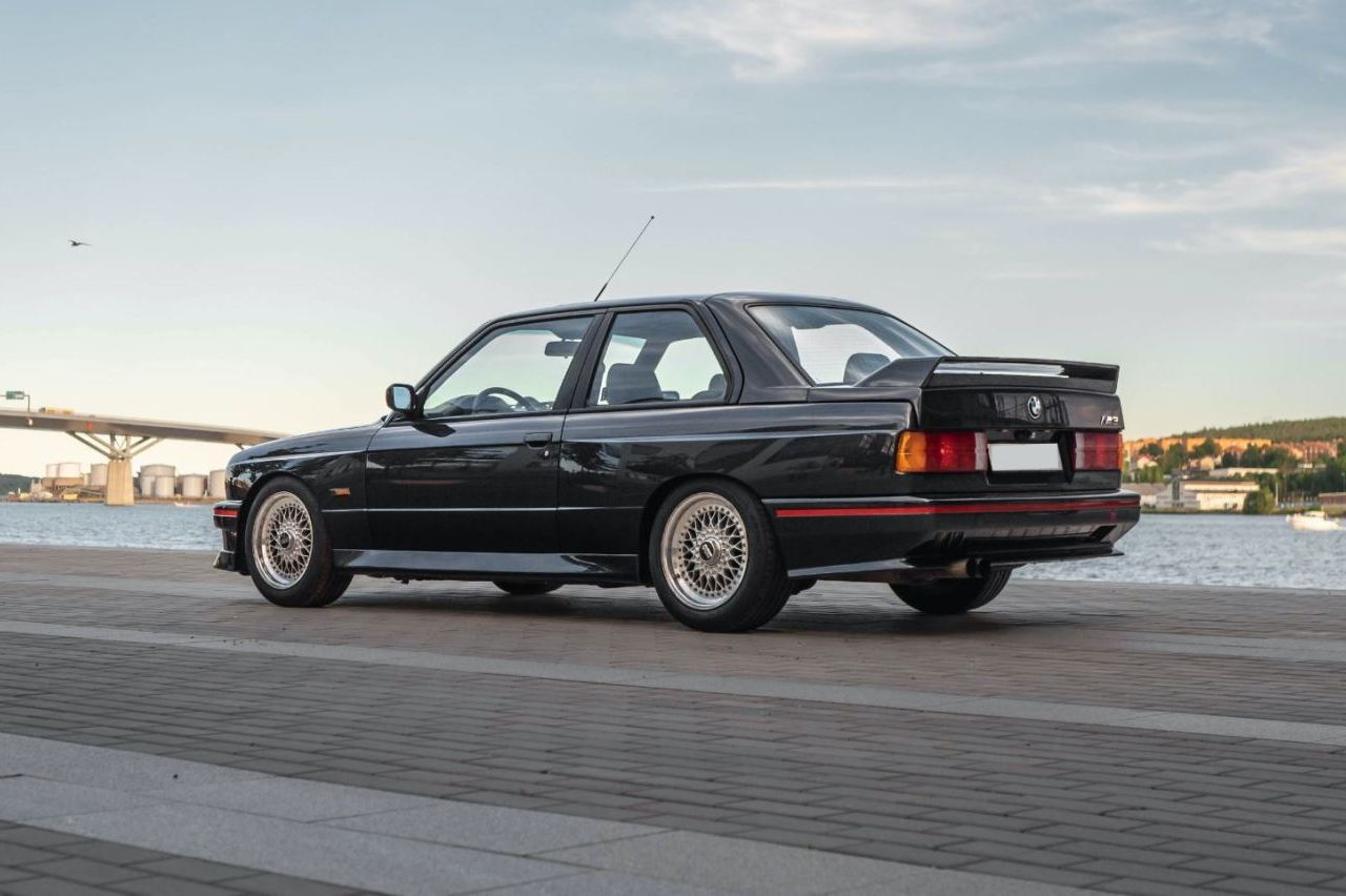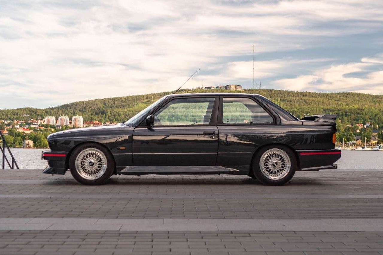 Se dice que este ejemplar fue vendido nuevo en Alemania en 1987 y que se importó a Suecia dos años más tarde. Está terminado en negro diamante metalizado con asientos deportivos de cuero negro y tela gris oscura e inserciones de gamuza sintética negra en los paneles de las puertas, todo ello aderezado con costuras rojas en contraste. Este M3 E30 descansa sobre un juego de llantas de aleación BBS de 16 pulgadas con neumáticos Goodyear.