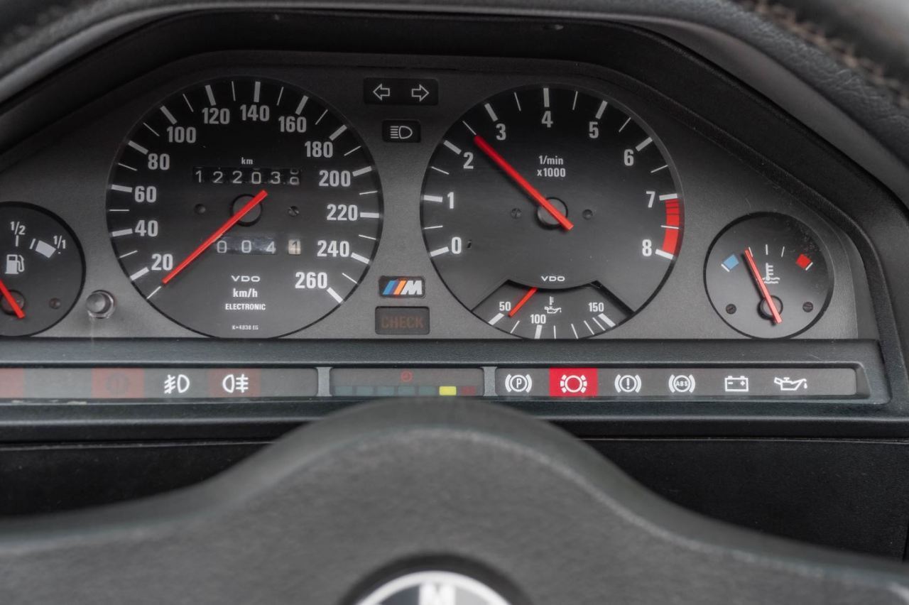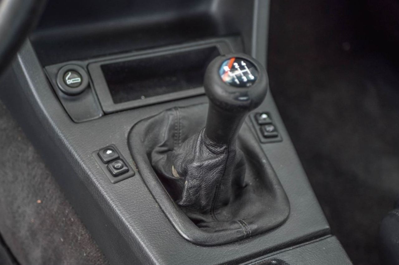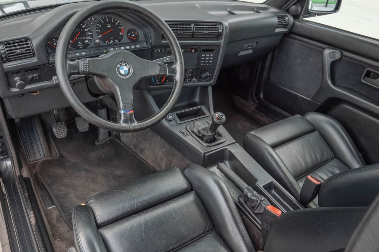 Se dice que este ejemplar fue vendido nuevo en Alemania en 1987 y que se importó a Suecia dos años más tarde. Está terminado en negro diamante metalizado con asientos deportivos de cuero negro y tela gris oscura e inserciones de gamuza sintética negra en los paneles de las puertas, todo ello aderezado con costuras rojas en contraste. Este M3 E30 descansa sobre un juego de llantas de aleación BBS de 16 pulgadas con neumáticos Goodyear.