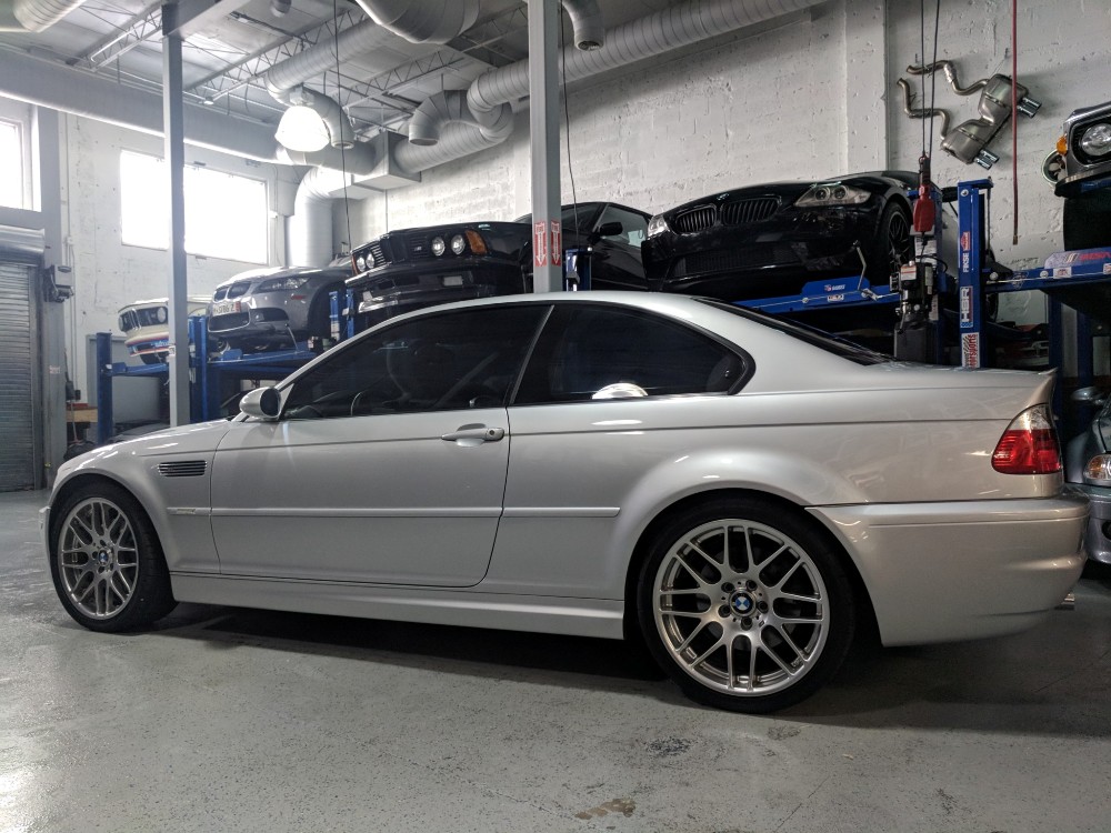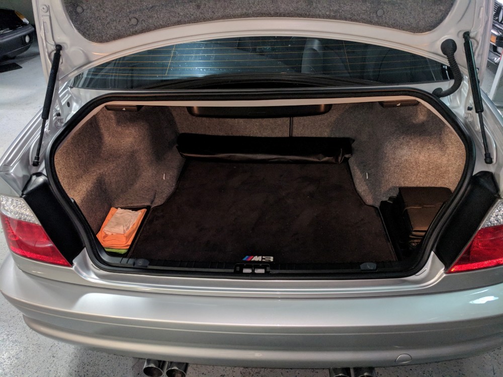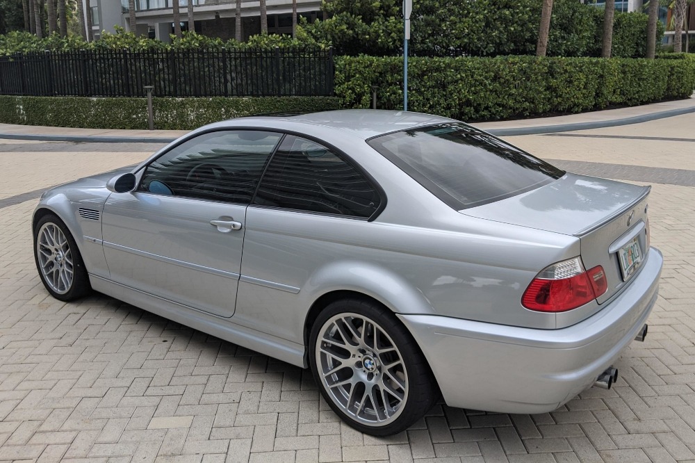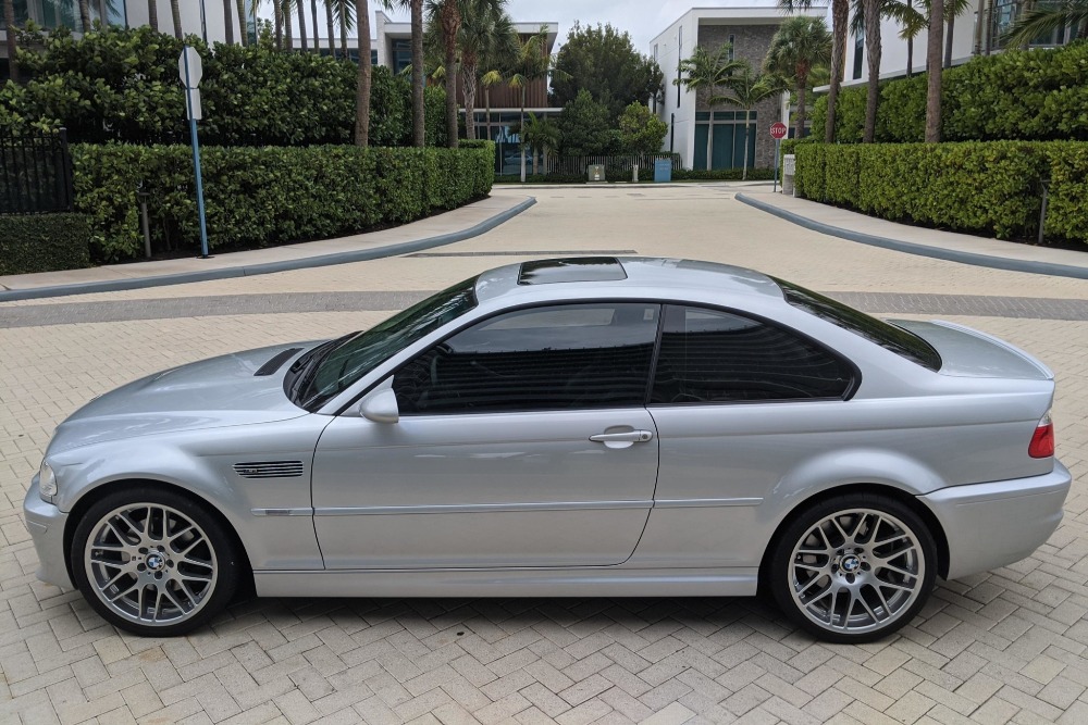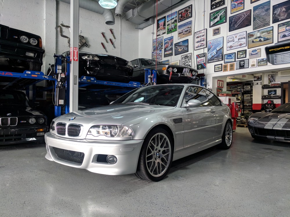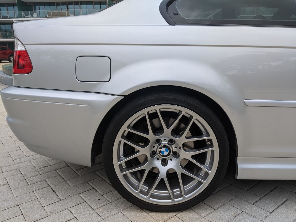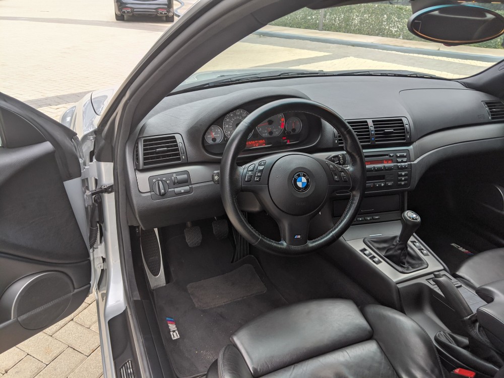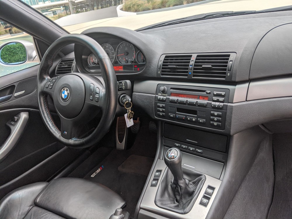 Esta unidad en particular del BMW M3 E46 está terminada en color Titanium Silver Metallic y dispone de una serie de opciones de equipamiento originales, como los faros de xenón, sensor de lluvia, techo solar eléctrico y faros traseros de LED. Además, luce un juego de llantas de 19 pulgadas envueltas en neumáticos Bridgestone Potenza. En su interior, este BMW incluye asientos deportivos ajustables en negro con función memoria en el lado del conductor. También está disponible un sistema de sonido Harman Kardon, climatizador automático, control de velocidad de crucero y volante multifunción terminado en cuero.