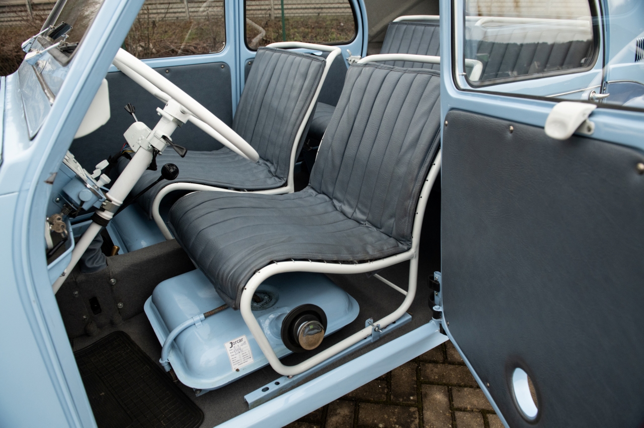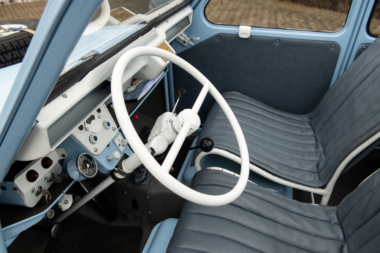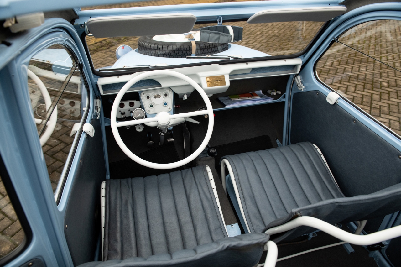 Sin embargo, este Citroën 2CV 4x4 Sahara de 1964 ha cambiado de manos en varias ocasiones hasta que fue subastado en 2018, donde lo adquirió su actual propietario. Hoy, el vehículo está terminado en dos tonos de azul sobre llantas de color blanco. Luce una rueda de repuesto montada sobre el capó delantero y un techo de lona gris y azul. El interior combina un tapizado de cuero gris oscuro con elementos estructurales y del salpicadero en blanco.