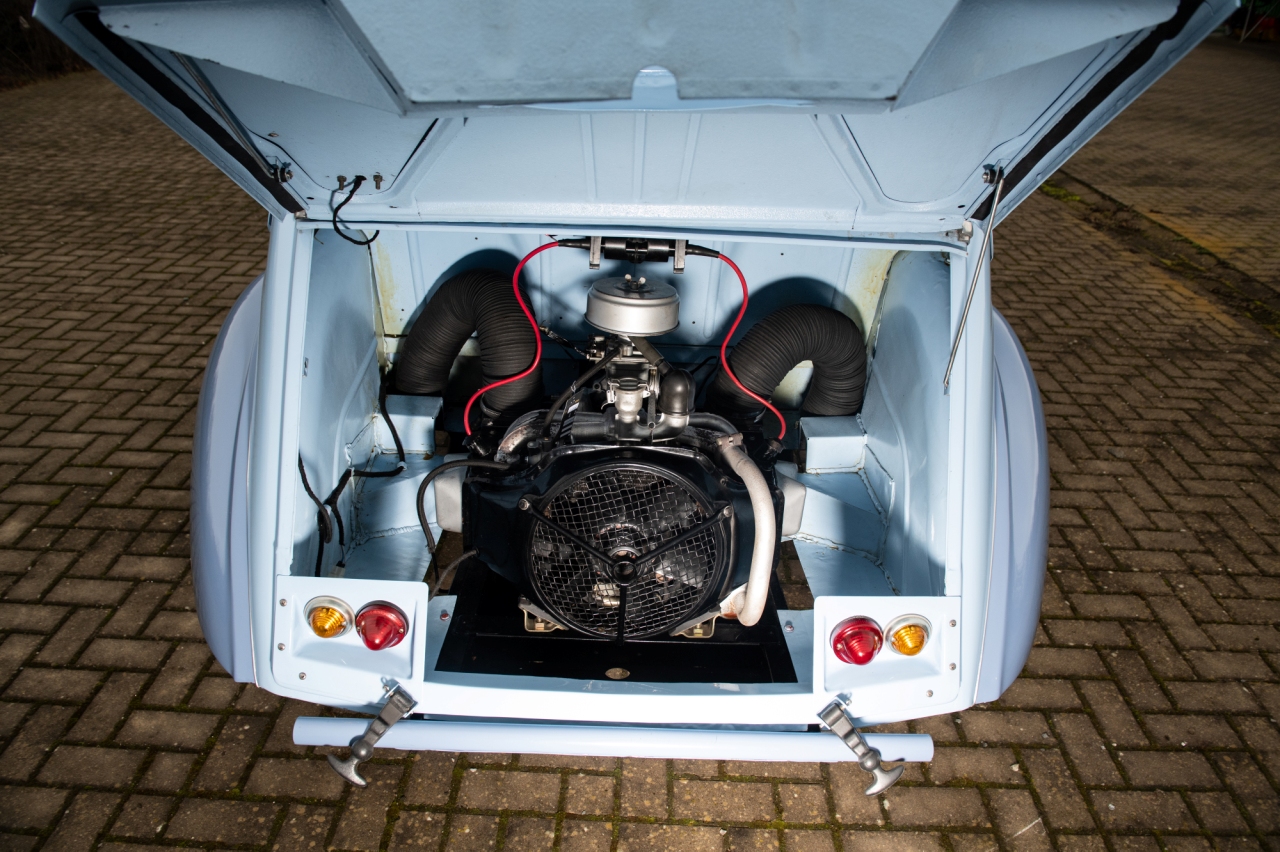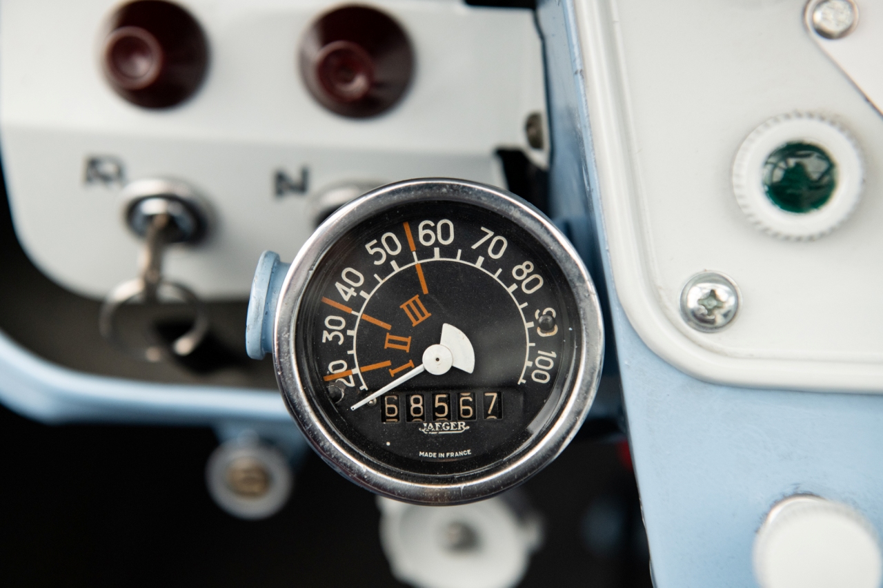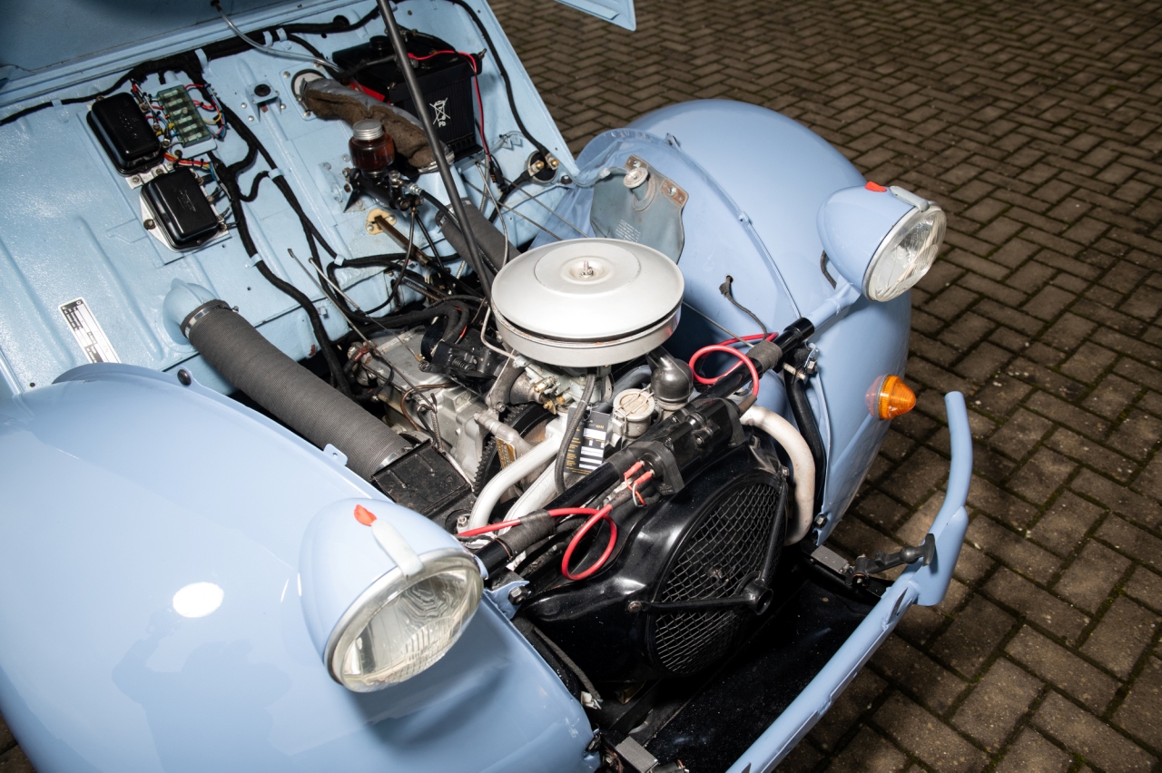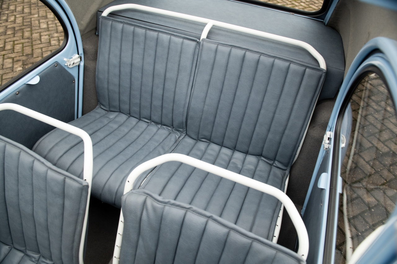 Sin embargo, este Citroën 2CV 4x4 Sahara de 1964 ha cambiado de manos en varias ocasiones hasta que fue subastado en 2018, donde lo adquirió su actual propietario. Hoy, el vehículo está terminado en dos tonos de azul sobre llantas de color blanco. Luce una rueda de repuesto montada sobre el capó delantero y un techo de lona gris y azul. El interior combina un tapizado de cuero gris oscuro con elementos estructurales y del salpicadero en blanco.