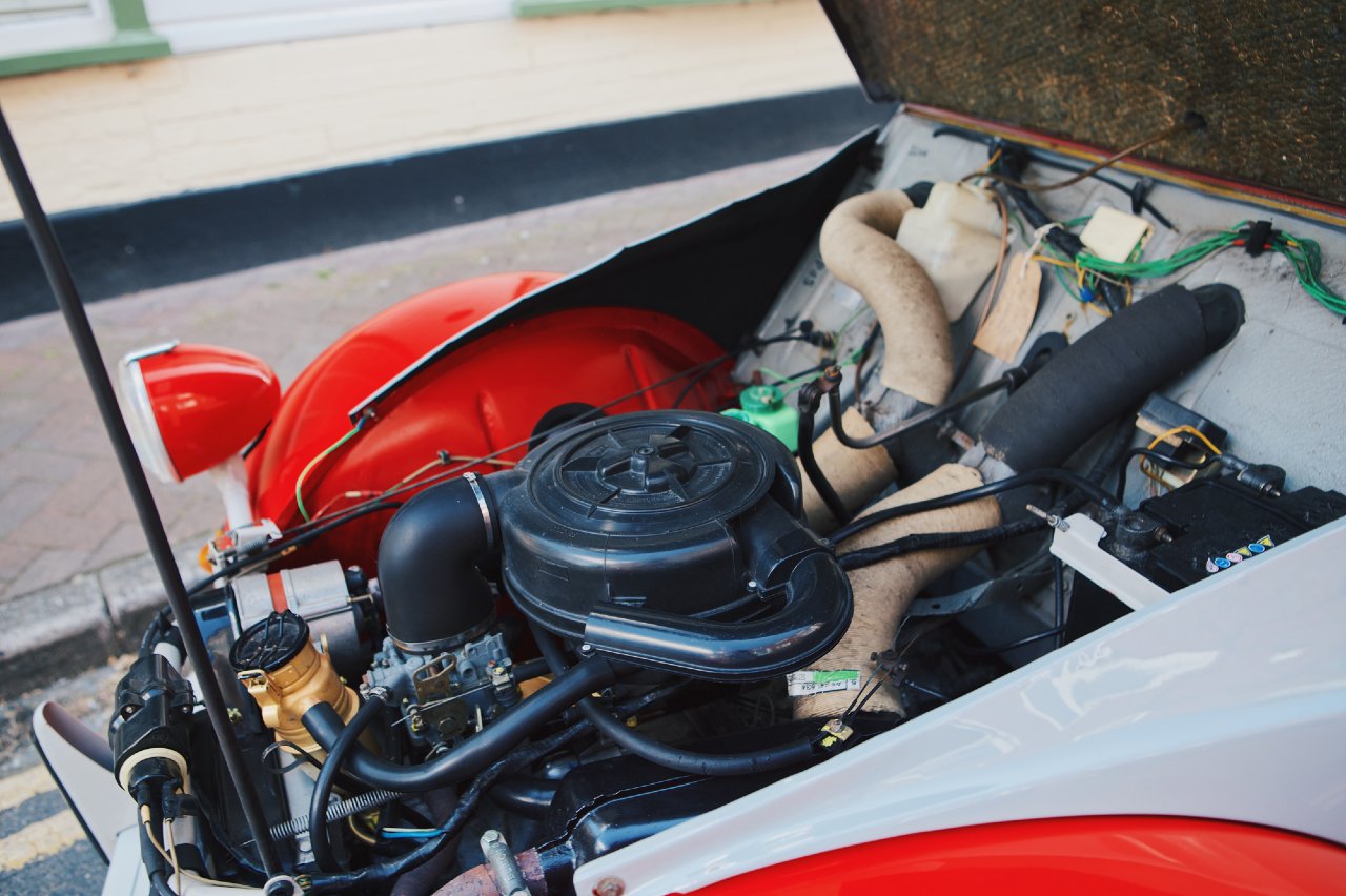 Su estado es inmaculado, sobre todo en el exterior, que llama la atención por la combinación cromática rojo y gris de la carrocería, a la que se suman además las llantas de color blanco. El interior es realmente sencillo y presenta unas banquetas tapizadas en tela que también están en muy buen estado.