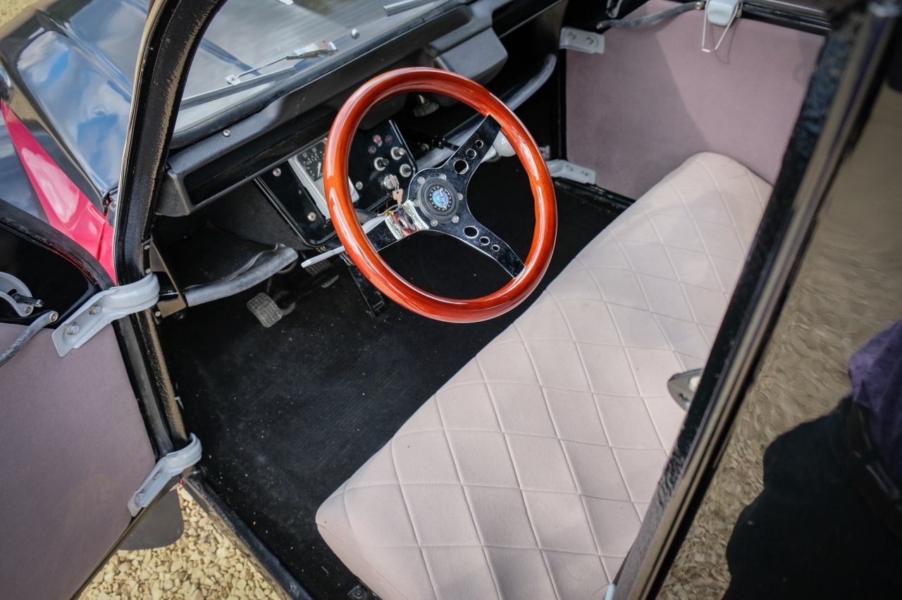 Sin embargo, el volante no es el elemento personalizado más importante en este coche. Lo más destacado es, sin duda, la caja de madera que convierte a este 2 CV en una pequeña camioneta de inspiración agrícola. Se han instalado unos guardabarros personalizados para las ruedas traseras, que cuentan con las mismas llantas de color rojo con un tapacubo cromado en el centro.
