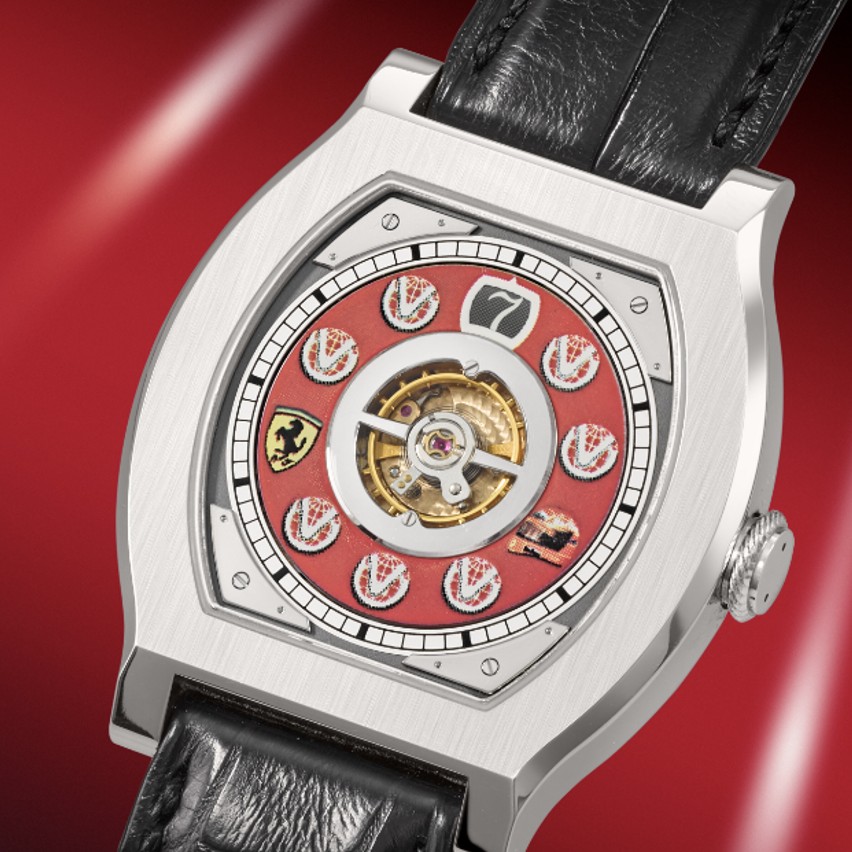 Por otro lado, hay un F.P. Journe Vagabondage de platino con una esfera hecha a medida y una dedicatoria grabada en el movimiento de oro de 18 quilates: ‘X-MAS 2004 Jean Todt for my friend Michael Schumacher’. En este caso incluye referencias a los siete títulos de F1, junto con el caso y el logo de Ferrari.