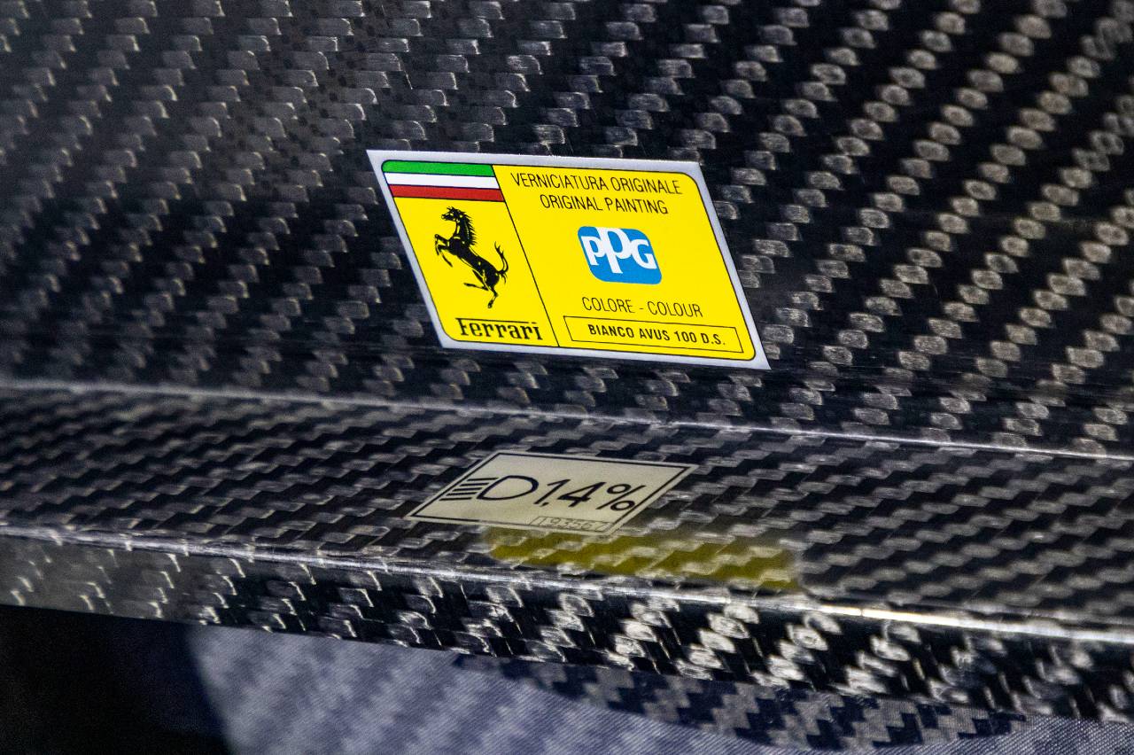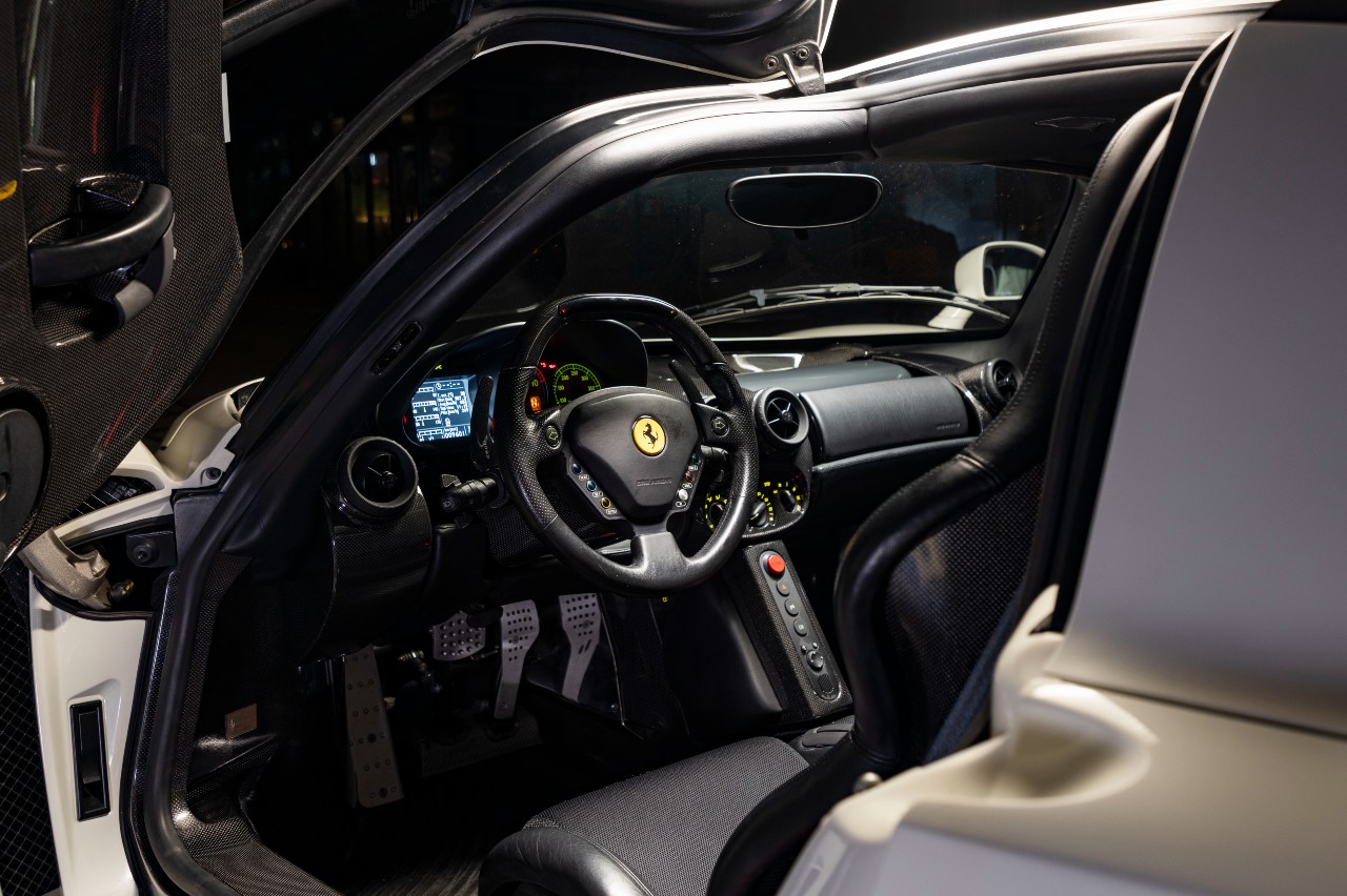 De todos los Enzo fabricados (400 en total), hubo una serie de 20 unidades llamada los ‘Extracampionario’, reservada para algunos de los clientes más exclusivos de Ferrari y en la que cada coche lucía un coche diferente a los estándar. Esto hace que estas dos decenas destaquen entre el resto de ejemplares, y dentro de ellas el chasis 133023 es el único fabricado con la carrocería en color blanco ‘Bianco Avus’.