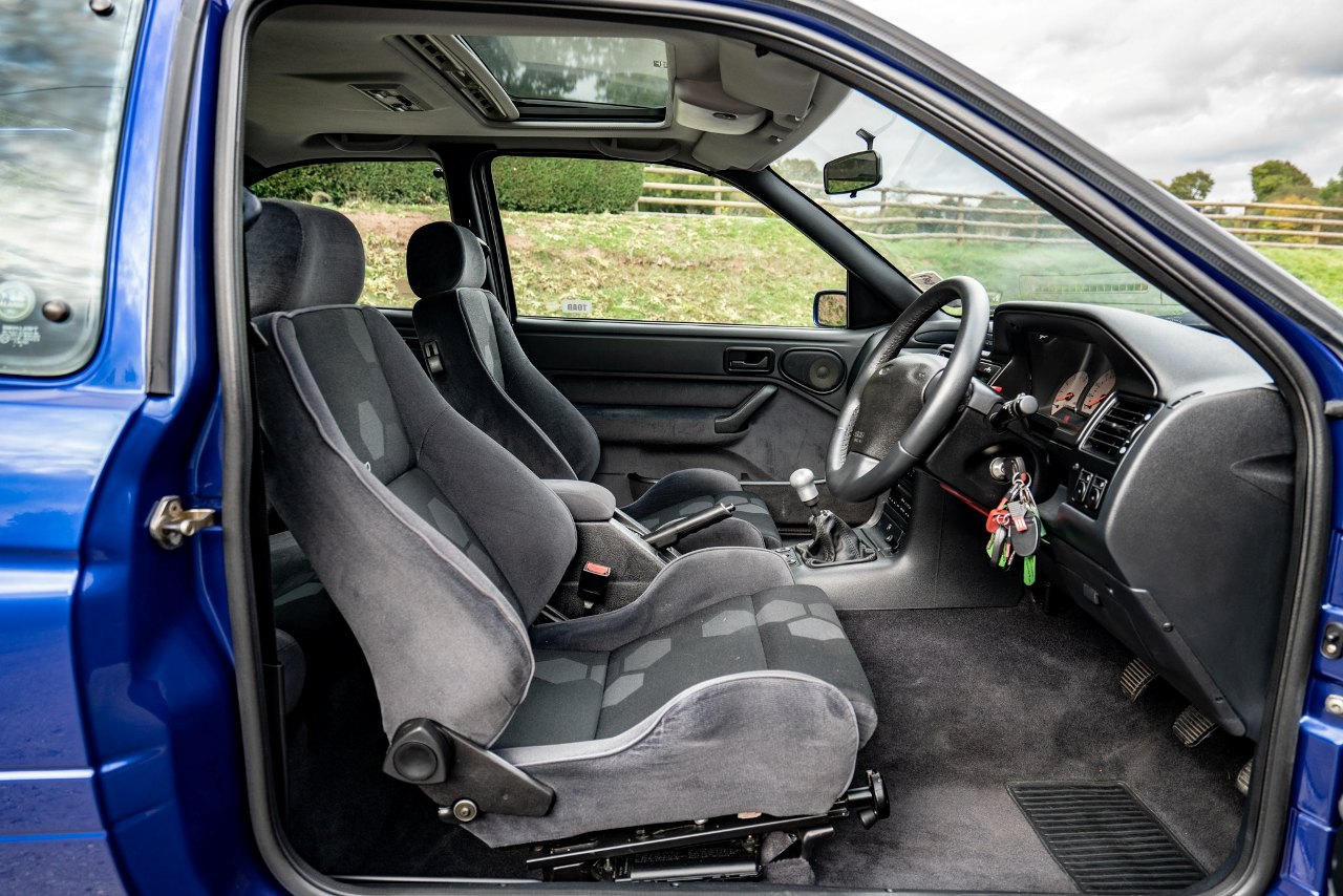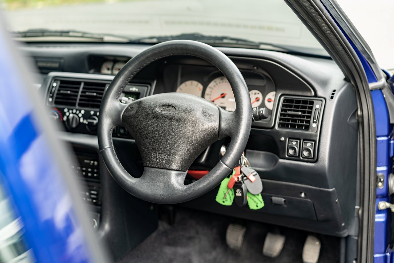 Este ejemplar en particular se adquirió nuevo en el Reino Unido en 1996. Desde entonces, este Ford Escort RS Cosworth ha tenido tres propietarios diferentes que han cumplido con un estricto mantenimiento sin acumular demasiados kilómetros en su marcador. La carrocería está terminada en Imperial Blue Metallic sobre un interior de tela gris y negra. No presenta daños en la carrocería ni signos muy acusados de desgaste en el habitáculo.