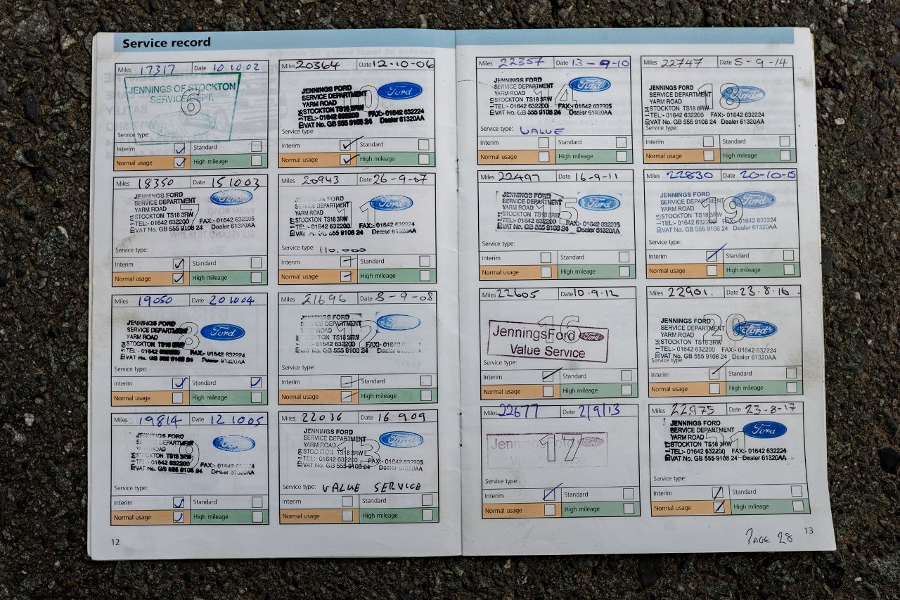 Mención especial merece el completo historial de mantenimiento que incluye este vehículo. Desde 1996, se ha realizado una revisión oficial en talleres de Ford cada año, reemplazando la correa de distribución cada cinco años. Resulta llamativo que en muchas ocasiones se han realizado revisiones tras haber recorrido apenas 70 millas (112 kilómetros) en un año.