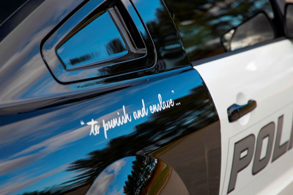 Está completamente caracterizado como Barricade, con la decoración de la policía de 1985 y algunos detalles específicos, como el logo de los Decepticons tras los pasos de rueda delanteros y una reinterpretación libre del clásico lema de “servir y proteger” de los cuerpos de seguridad, transformado aquí en un “castigar y esclavizar” que queda visible en su aleta trasera derecha.