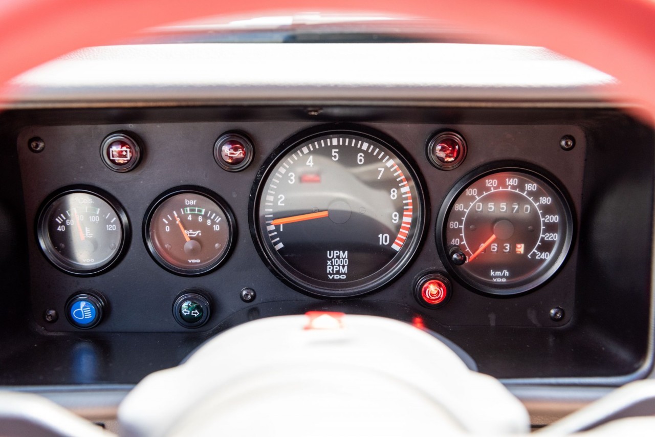 Y, en concreto, este excepcional Ford RS200 de 1986 no debería haber perdido muchos de ellos. Porque no solo lleva un mantenimiento riguroso, sino que el año pasado se le sustituyó el turbo. Pintado en color Diamond White, tanto los asientos tipo baquet como el volante y... por alguna razón, el retrovisor izquierdo, van en rojo. Algunos más de sus elementos se han cambiado en estos 35 años de historia. Por ejemplo, las llantas de magnesio de Ford Motorsport, instaladas en 2011. Pero la mayoría del habitáculo está en condiciones prístinas, como recién salido de fábrica.