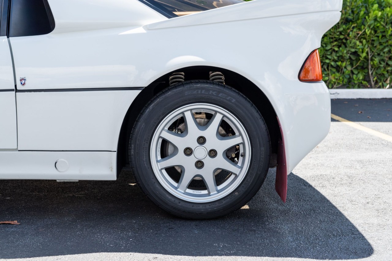 Primero, hay que decir que se trata de una de las apenas 140 unidades que Ford fabricó para cumplir los requisitos de homologación del Grupo B. Pero, al contrario que la mayoría de sus rivales, su carrocería era completamente original, y no se basaba en ningún modelo de producción preexistente. Diseñada por Ghia, también la hacía bastante especial el hecho de que, en gran parte, fuera de fibra de vidrio. Además, la entrada de aire en el techo, los faros redondos, los faros auxiliares de rally de Hella y el característico alerón trasero convierten su silueta en más que reconocible.