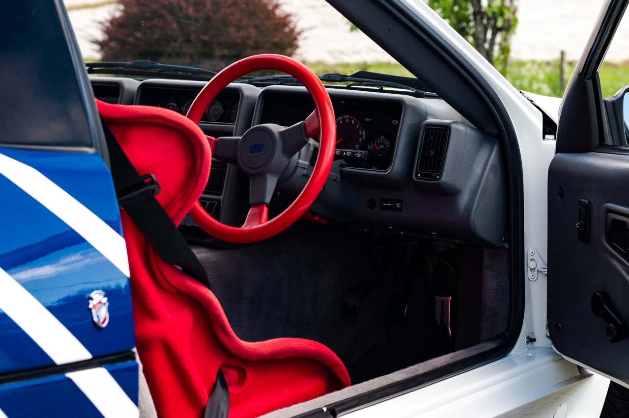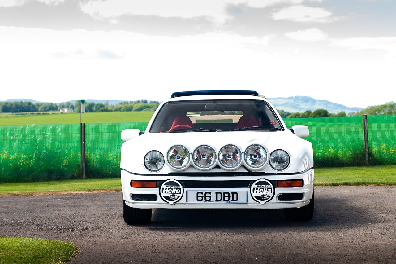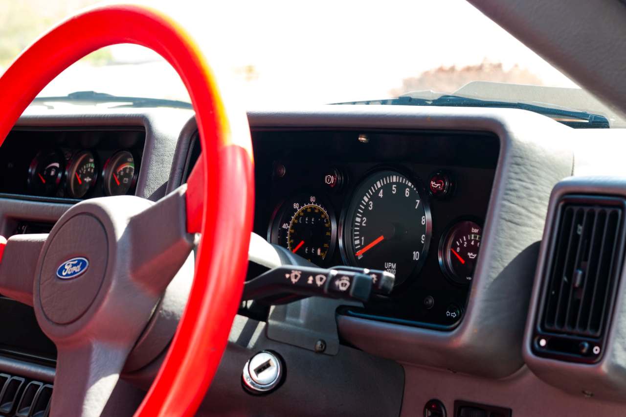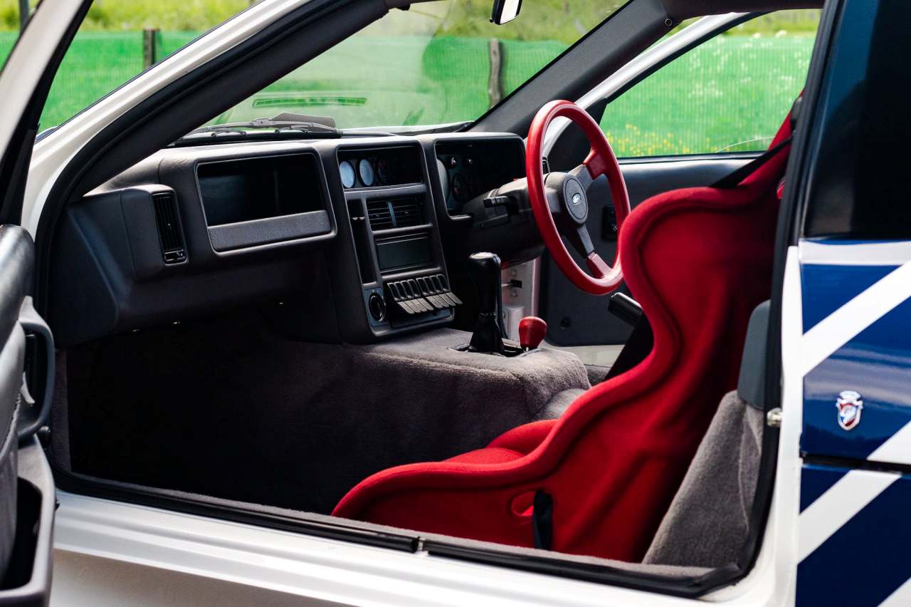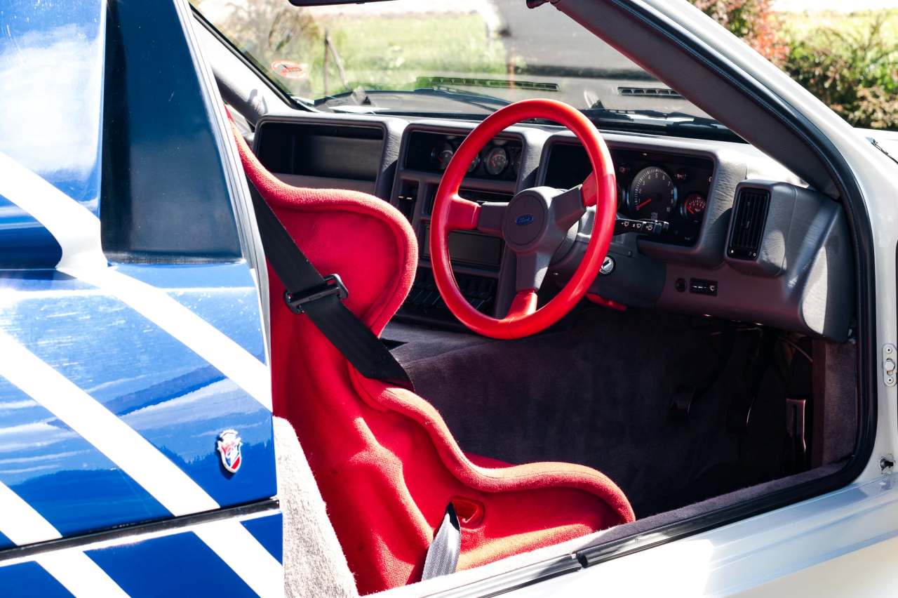 Este ejemplar en particular está matriculado en septiembre de 1988 y se entregó nuevo por el concesionario Ford Dees en Croydon (Reino Unido). Se trata de una unidad con el volante a la derecha, con una carrocería con acabado en gel coat blanco y un interior con moqueta gris y asientos baquet de color rojo. El exterior luce una decoración de carreras azul sobre llantas Ford Performance de 16 pulgadas originales y neumáticos Yokohama. También equipa un grupo de cuatro faros auxiliares montados sobre el capó y una pareja de faros Hella, ambos con cubiertas específicas.
