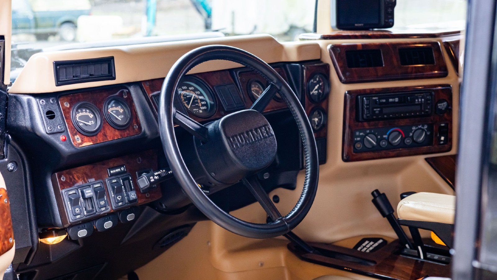 El opulento interior del lujoso 4x4 se ha mantenido prácticamente intacto desde que Tupac fue su propietario, con un acabado muy propio de los años 90, combinando cuero beige y molduras de madera lacada. Es el tipo de interior que cabría esperar en un Jaguar XJ, pero no se trata de una limusina de club de campo: debajo se oculta un vehículo militar Humvee que utilizaba el ejército estadounidense.