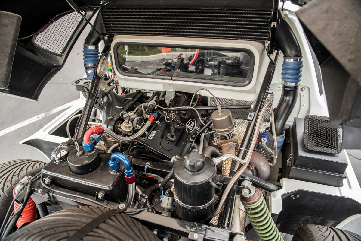 Del Ford RS200 se construyeron un total de 146 coches de calle. Y en esa suma están incluidos los 24 ejemplares con especificaciones Evolution, como el que nos ocupa. Estos coches contaban con unas características todavía más radicales y eran más parecidos si cabe a la versión más evolucionada del modelo que, por desgracia, nunca llegó competir en el Grupo B. El motor 1.8 turbo original fue remplazado por una unidad modificada con 2.1 litros, también construida por Cosworth.