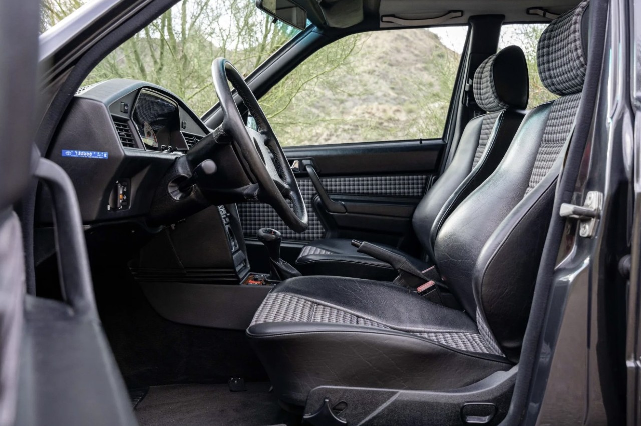 El interior está en un estado igual de óptimo que el exterior, con asientos Recaro tapizados en tartán y cuero negro, aplique de madera alrededor de la palanca de cambios (el pomo muestra cierto desgaste) y, como era habitual en la época, todos los controles e instrumentación analógicos.