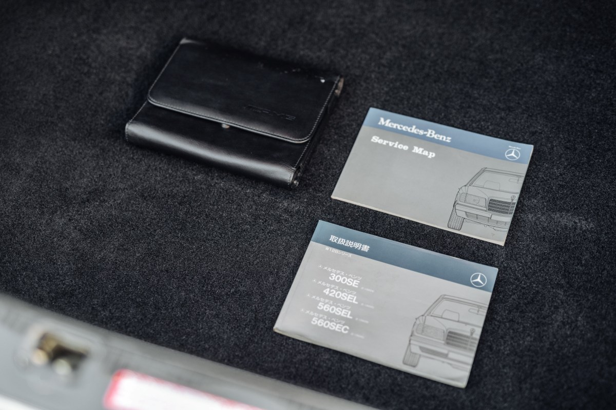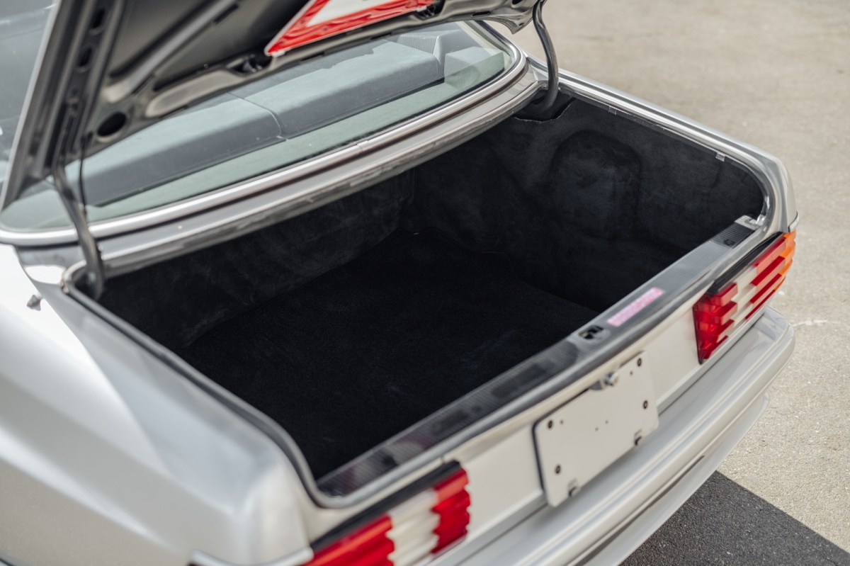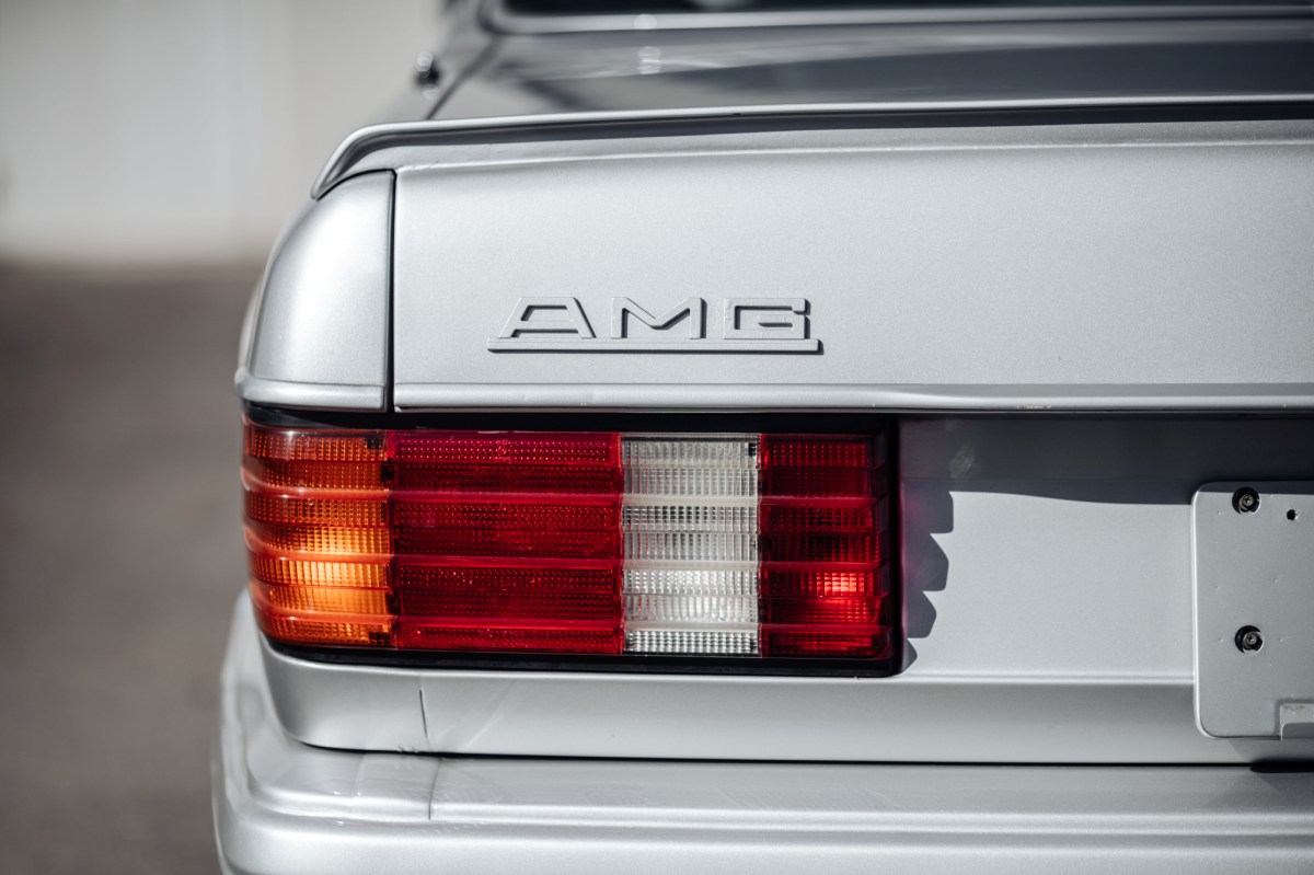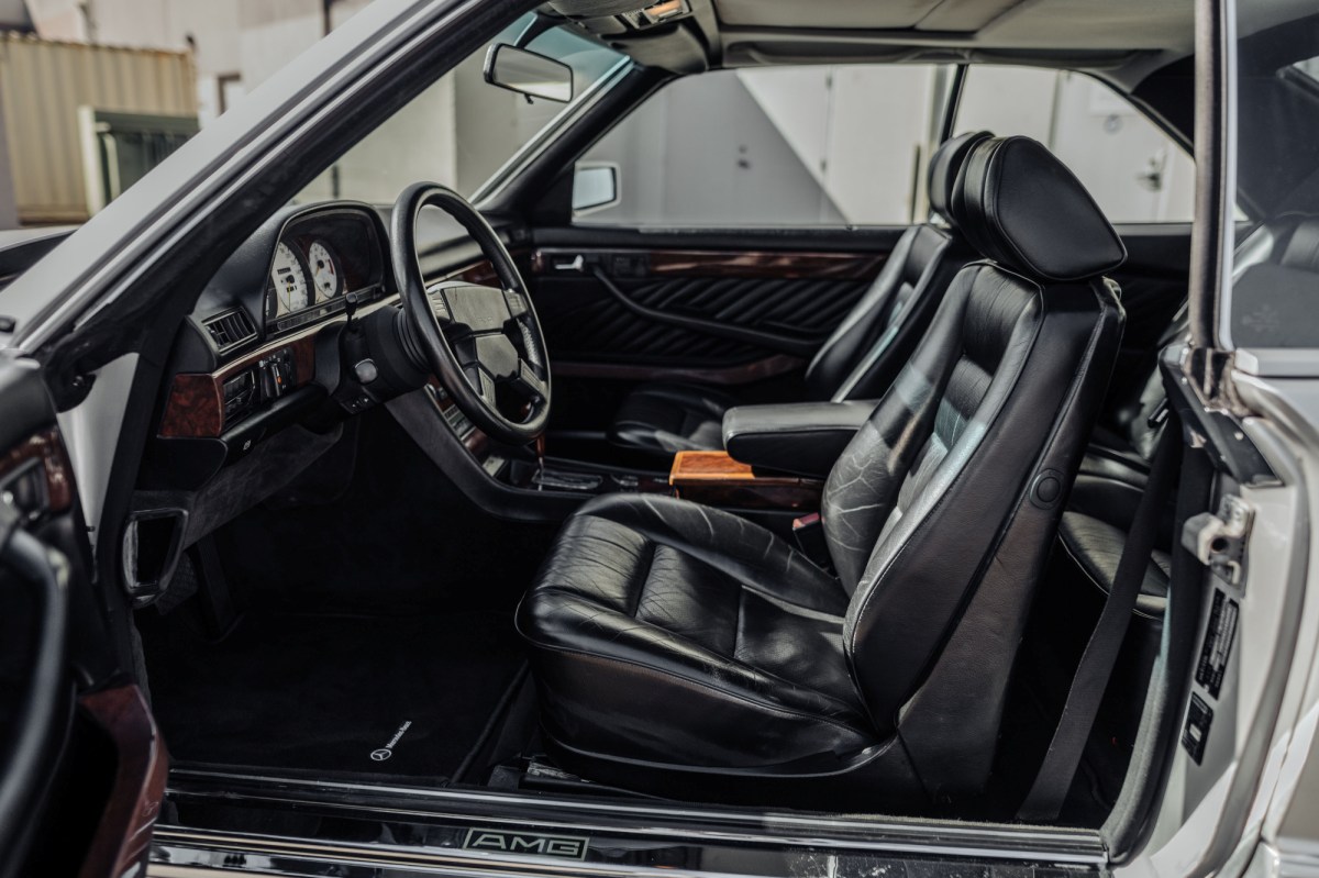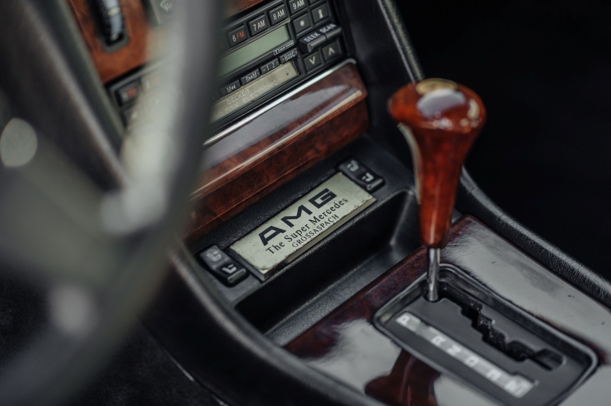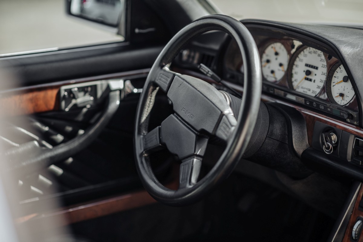 El interior en antracita está acompañado de un volante AMG by Momo M38 junto a un cuadro de instrumentos con fondo blanco. En él podemos ver que desde 1989 ha cubierto un total de 90.393 kilómetros. Aunque no se ha incluido ninguna tasación del precio estimado de venta de esta unidad en el número de lote de la subasta, el comprador se llevará el coche junto a un manual japonés, un libro de revisiones sellado, una bolsa AMG para los documentos, un gato y una rueda de repuesto.