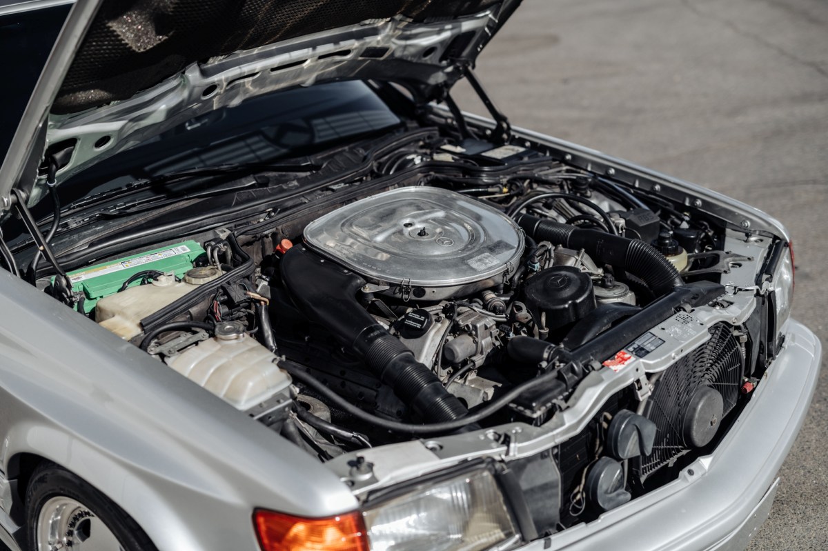 El trabajo de AMG consistió en modificar el motor M117 V8 de 5.5 litros y aumentar su cilindrada hasta los 6.0 litros, equiparlo con una pareja de árboles de levas y dos culatas patentadas de 16 válvulas. También se implementó un cuerpo de acelerador modificado, un nuevo escape y un colector de admisión modificado. El resultado son 385 CV de potencia y el doble de par motor a la mitad de revoluciones. Todas estas modificaciones, unidas a un kit de carrocería específico, hicieron del 560 SEC AMG 6.0 uno de los coches más caros de su época.