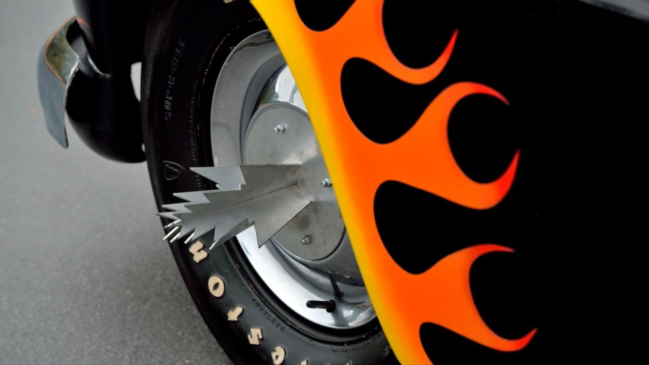El coche apareció en la película ‘Grease’ de 1978, es conocido como ‘Hell’s Charriot’ (Carro del infierno) y lo conducía el rival de Danny Zuko (John Travolta) en la película, interpretado por Dennis Stewart. Es un Mercury de 1949 cuya carrocería está terminada en negro brillante y luce una decoración de llamas presente en los guardabarros y los faros delanteros. En el centro de las llantas se incluyen unos tapacubos puntiagudos y están recubiertas con neumáticos Firestone clásicos.