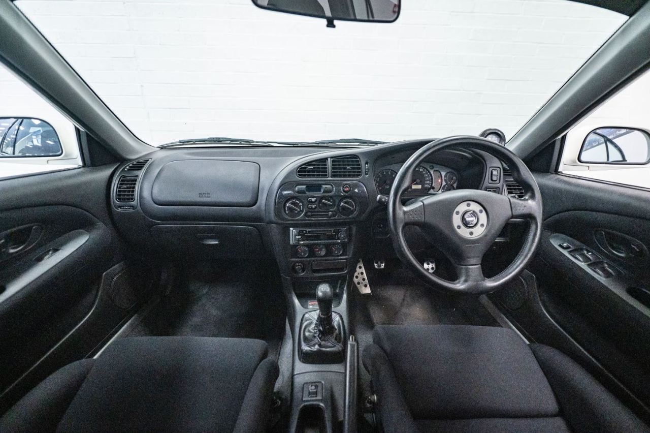 Luce el color exterior Scotia White, a juego con unas llantas Speedline Turini que van envueltas en neumáticos Toyo R888R. El exterior está en muy buenas condiciones y mantiene la pintura original excepto en algunas zonas en las que ha sido necesario repintar. El interior, por su parte, tampoco presenta excesivas muestras de uso.