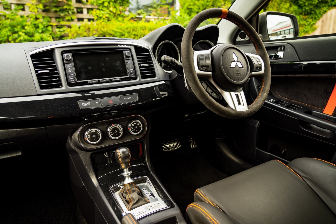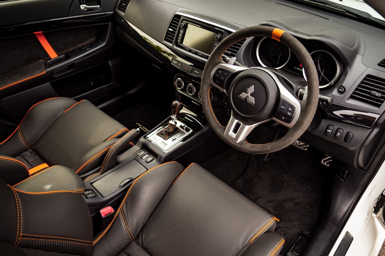 Este Lancer Evo X incluye una serie de extras por valor de más de 11.000 euros, que incluye rejillas de carbono en las aletas del capó, tapicería de cuero a medida, un juego de alfombrillas premium, llantas bañadas en carbono BBS, cristales oscurecidos, suspensiones rebajadas, faldones delanteros y traseros y un sistema antirrobo Cobra Trak5.