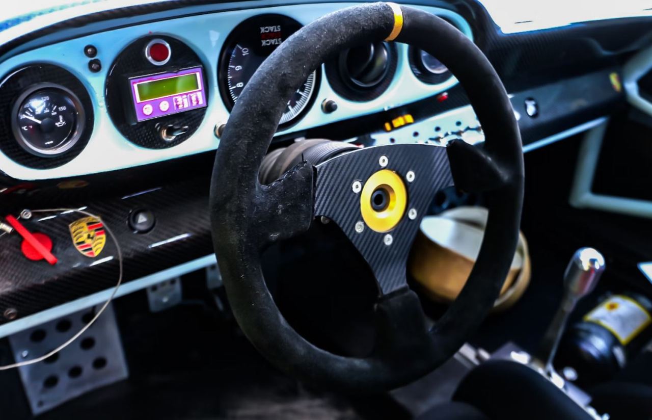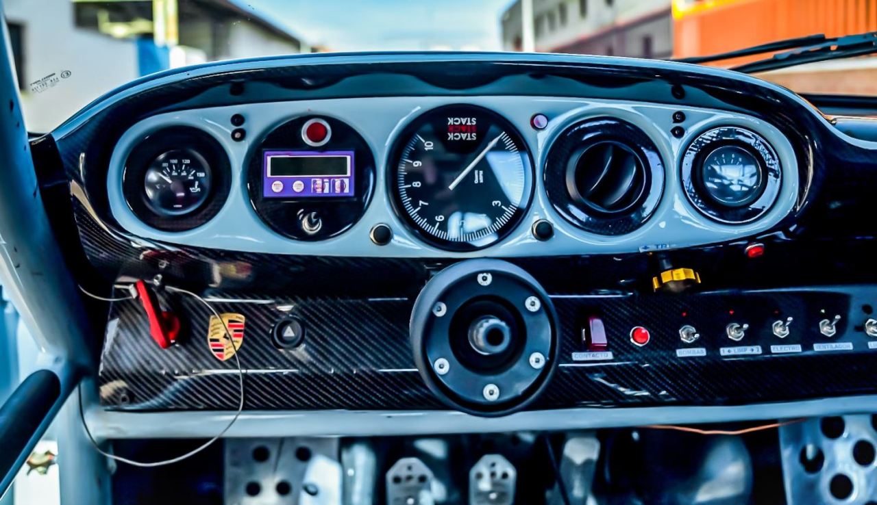 El interior fue completamente desmontado y en él se instaló una jaula antivuelco. La cabina de este Porsche 912 de 1966 incluye paneles de fibra de carbono, un volante de tres radios forrado en Alcantara y un cuadro de instrumentos personalizado con cinco esferas. En el salpicadero podemos ver un grupo de interruptores de palanca, acompañados por reposapiés perforados, unos asientos baquet Sparco y OMP con arneses de seguridad de las mismas marcas.