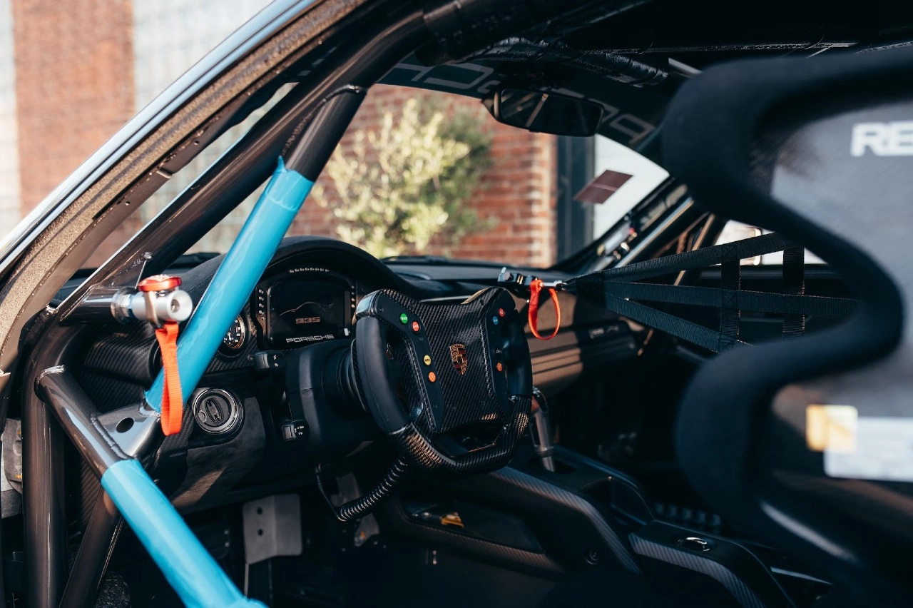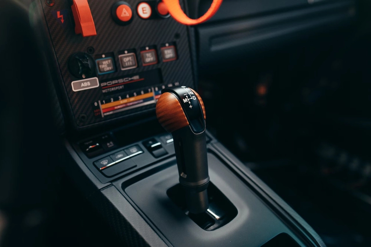 Dentro, encontramos un asiento de cubo firmado por Recaro, con arneses de carreras, un volante de fibra de carbono con pantalla a color procedente del 911 GT3 R, una jaula antivuelco y una exclusiva palanca del cambio PDK terminada en madera laminada.