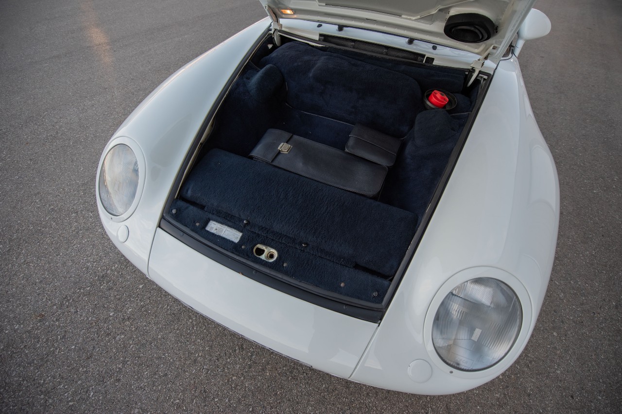 La carrocería está acabada en color Grand Prix White, a juego con las reconocibles llantas de cinco radios y 17 pulgadas, mientras que el interior está tapizado en cuero azul oscuro. Esto es propio de la versión Komfort, que contaba con añadidos que hacían del 959 un modelo más cómodo. Otros extras de la variante son el sistema de aire acondicionado, los asientos delanteros con ajuste eléctrico y calefactables, y el sistema de alarma.