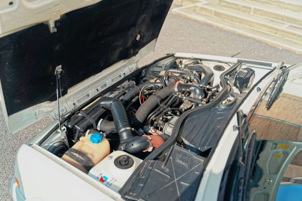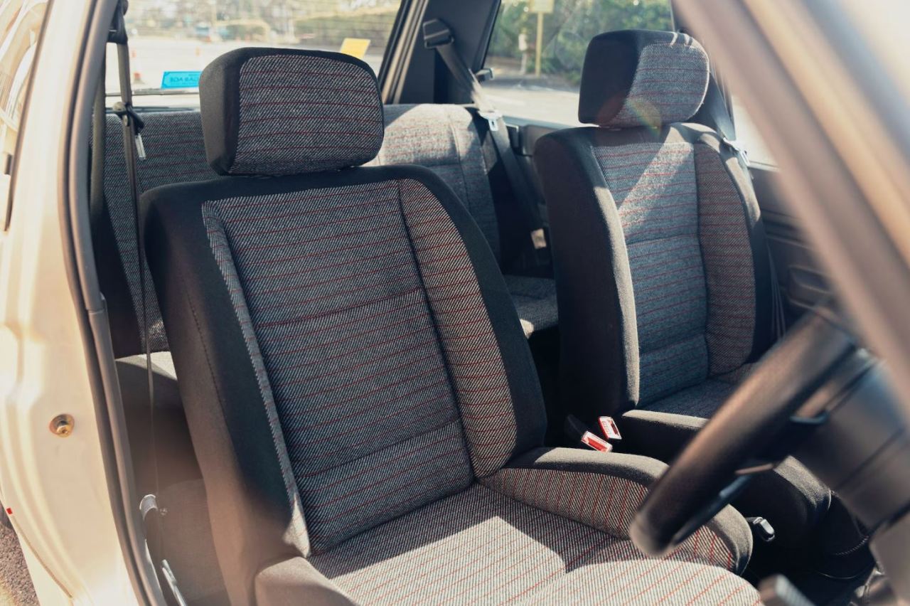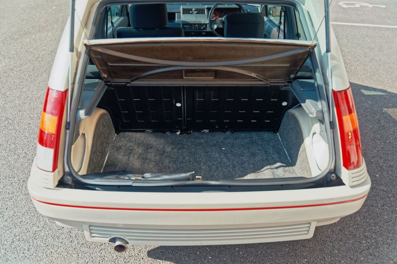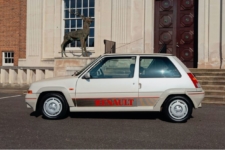 Se trata de un ejemplar de 1986 terminado en Blanco Perlado Metalizado con llamativos adhesivos grises y rojos de Renault en la parte inferior de las puertas y las aletas. Descansa sobre un juego de llantas plateadas de 13 pulgadas envueltas en neumáticos Avon CR27. El interior, mientras tanto, está terminado en tela negra y gris acentuada con una fina franja roja y diales del mismo color, a juego con los detalles rojos de la carrocería.
