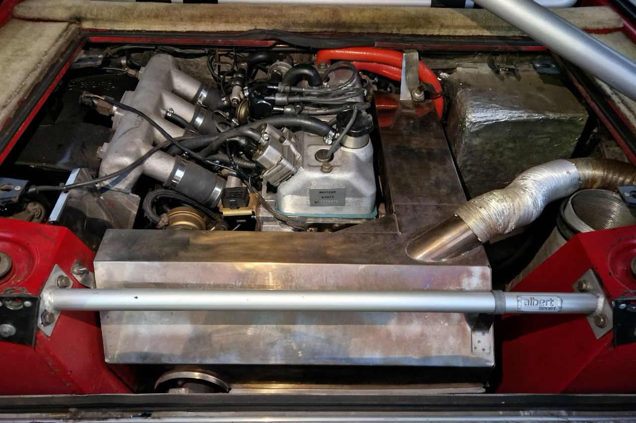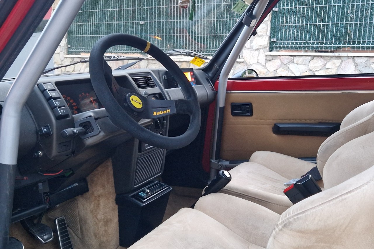 Está equipado con algunas mejoras de competición, como el volante Sabelt forrado en ante sintético con marcador a las 12, un ordenador de rally Terratrip, jaula antivuelco, un extintor y asientos con arneses Sabelt. Por fuera está acabado en rojo, tiene unas llantas blancas de múltiples radios y una franja solar ‘RENAULT’ en el parabrisas. El coche se repintó hace diez años.
