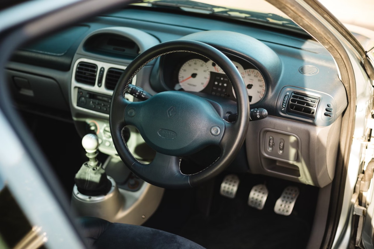 Se trata de una unidad muy especial, porque pertenece a uno de los 223 Clio V6 que se fabricaron para el Reino Unido con la icónica pintura Iceberg Silver metalizada, hecho totalmente a mano en Suecia por Tom Walkinshaw Racing. Este ejemplar, en concreto, es el número 160 de los 223.