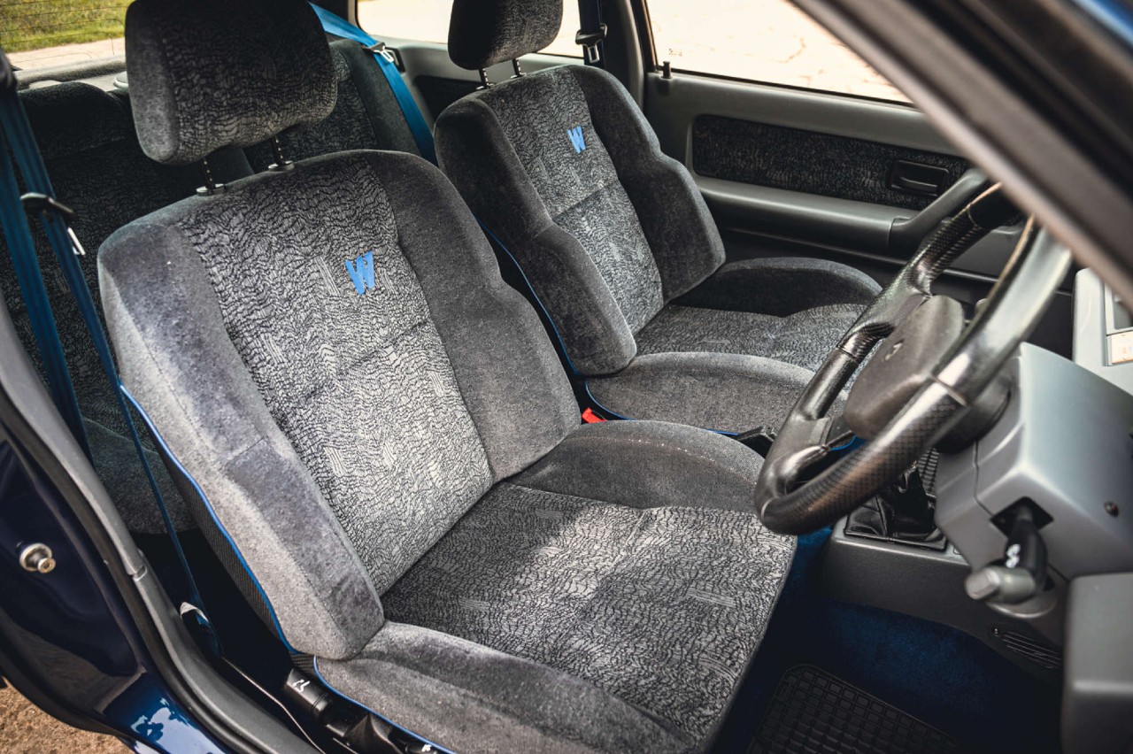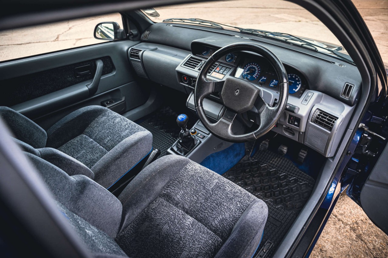 El odómetro marca 91.700 kilómetros, un kilometraje muy bajo para su edad, y presenta un estado de mecánica muy bueno, listo para seguir recorriendo kilómetros. Como puedes ver, la carrocería luce la icónica pintura ‘449’ Metallic Sports Blue, combinada con las llantas doradas 7J Speedline. Bajo el capó, se esconde el motor F7R de cuatro cilindros y de 2.0 litros con 150 CV, a 6.100 rpm y 171 Nm de par a 4.500 vueltas. Gracias a sus 981 kg de peso, el Clio Williams era capaz de acelerar de 0 a 100 km/h en 7,8 segundos y alcanzar los 215 km/h.