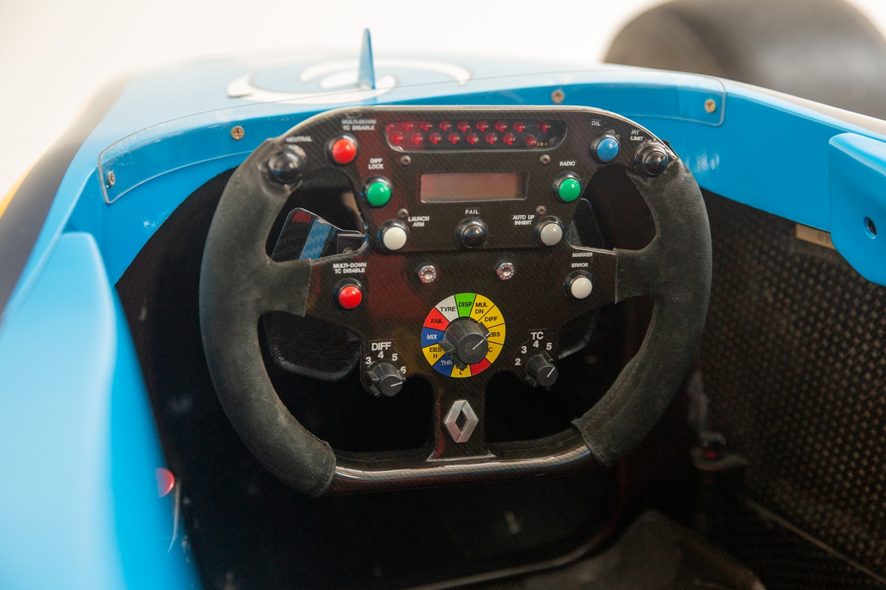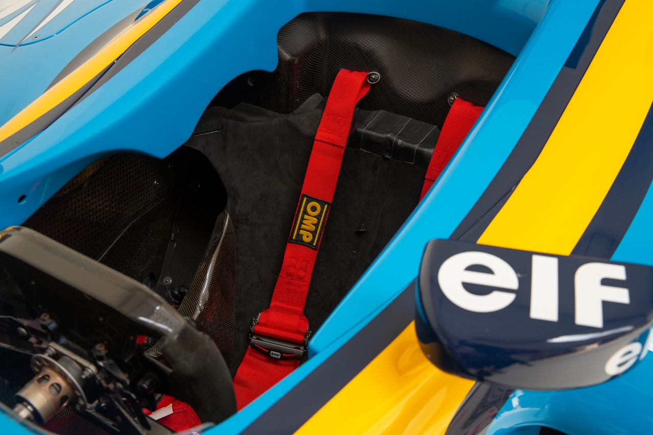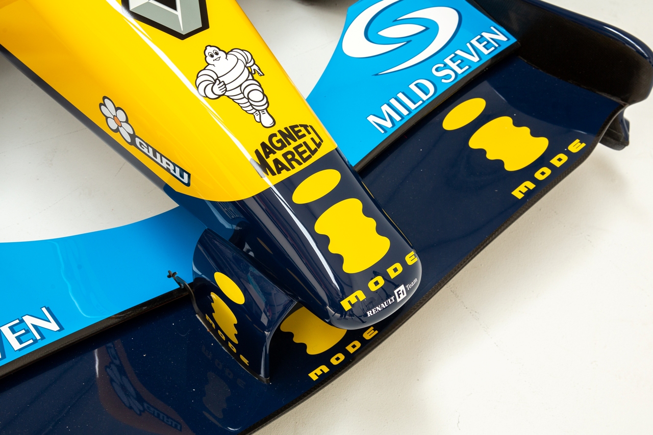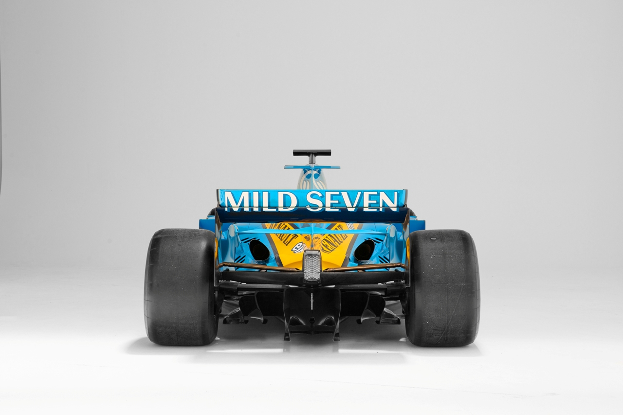 Según informa la casa de subastas RM Sotheby’s, este chasis del Renault R24 F1 de 2004 fue comisariado por Alpine antes de acabar en manos de su actual propietario, que lo compró en 2016. Fue entonces cuando se volvió a pintar y a adornar con la decoración azul y amarilla de Mild Seven y el patrocinador principal Telefónica.