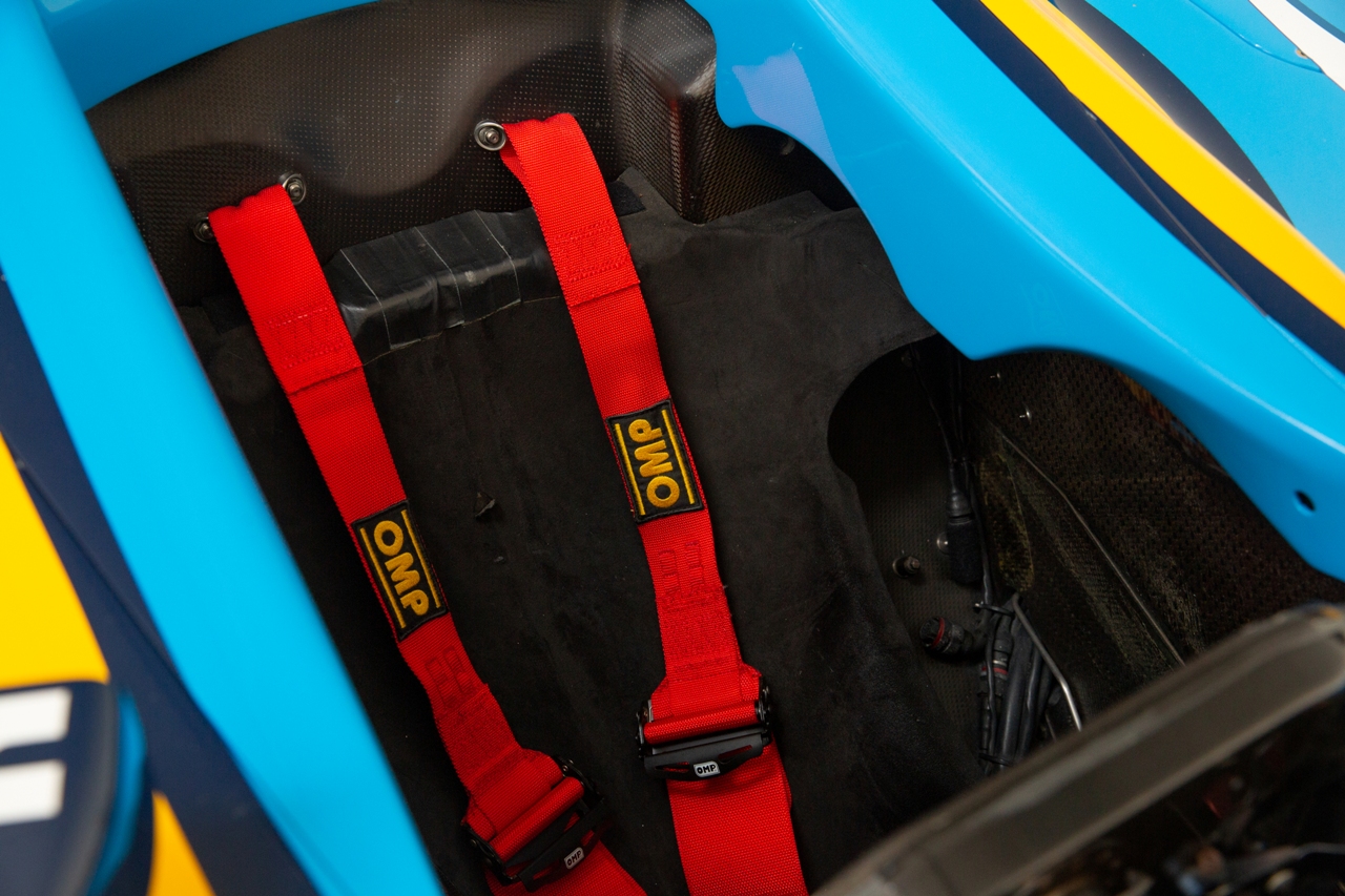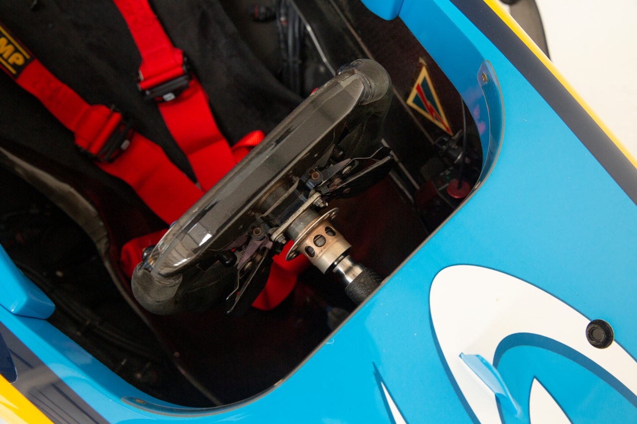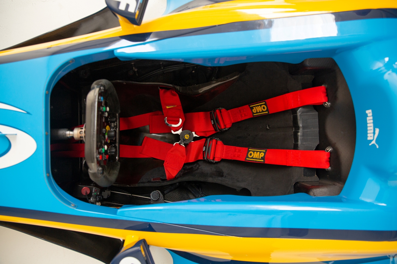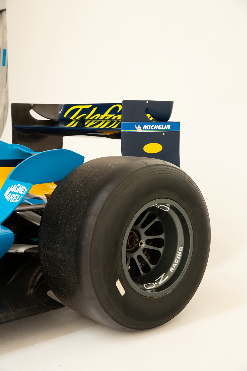 Según informa la casa de subastas RM Sotheby’s, este chasis del Renault R24 F1 de 2004 fue comisariado por Alpine antes de acabar en manos de su actual propietario, que lo compró en 2016. Fue entonces cuando se volvió a pintar y a adornar con la decoración azul y amarilla de Mild Seven y el patrocinador principal Telefónica.