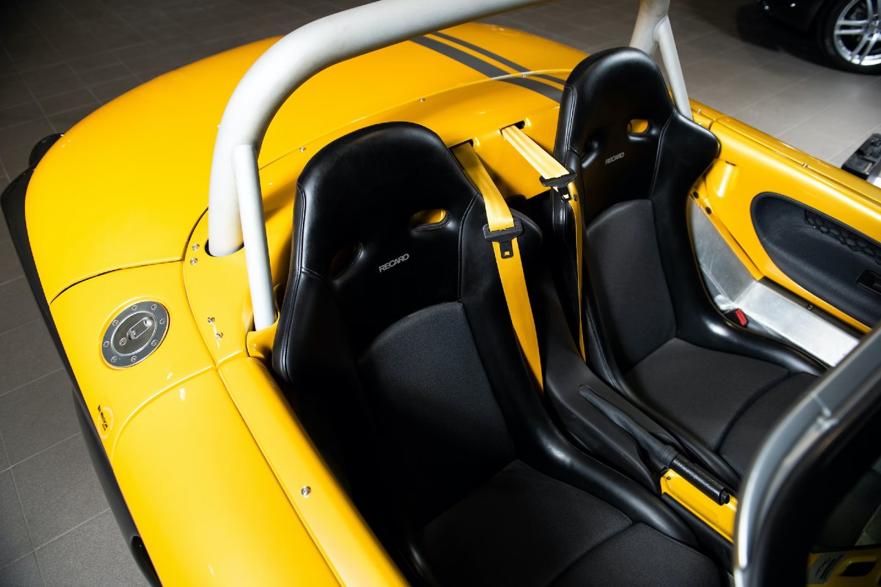 Esta unidad está terminada en color Sport Yelow con una tapicería de cuero negro en el interior. El equipamiento incluye un parabrisas opcional, asientos Recaro con cinturones de seguridad amarillos, un volante Atiwe y un cuadro de instrumentos con indicadores analógicos y un velocímetro digital.