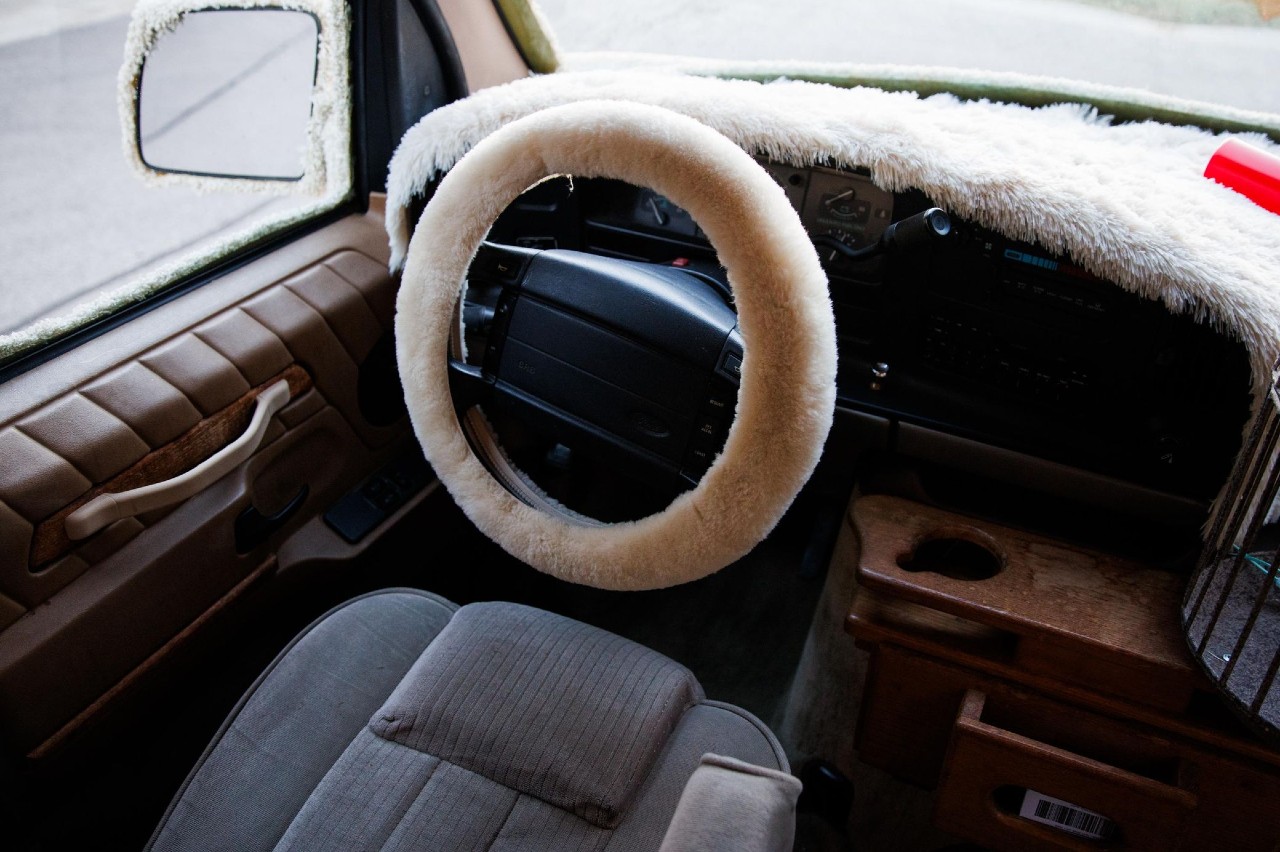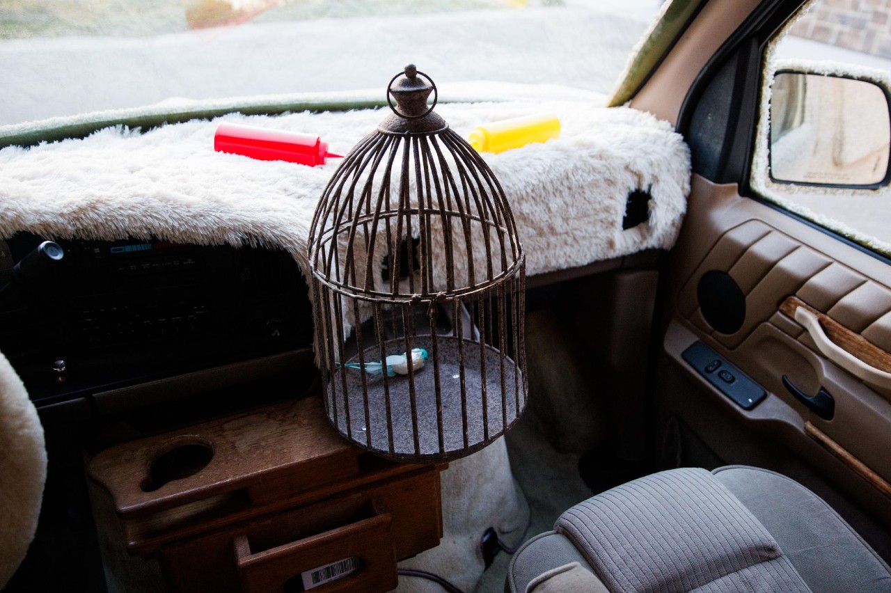 El interior está igualmente decorado con el salpicadero y el volante forrados con la misma piel del exterior y no falta tampoco la jaula de Petey el Pájaro, donde también hay un Petey falso con la cabeza pegada con cinta adhesiva.