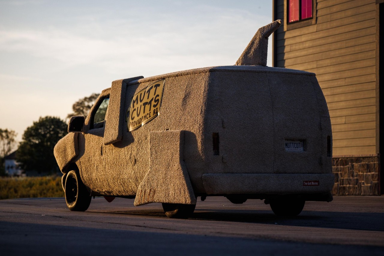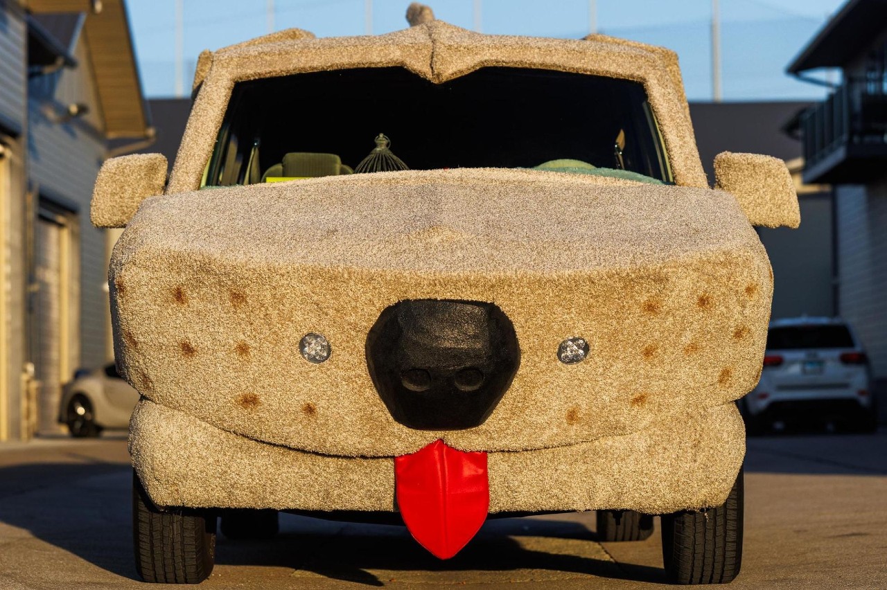 Aunque no sea la furgoneta de la película, hay algo en común con ésta. Bajo esa piel canina, se esconde una Ford E-150 Econoline de 1993. La han envuelto en una moqueta de color tostado y le han puesto orejas, nariz, lengua y cola de perro falsas, lo que le da un aspecto casi idéntico al del coche de la película. La verdad que, si eres capaz de encontrar alguna diferencia con la de la película, es que la has visto varias veces.