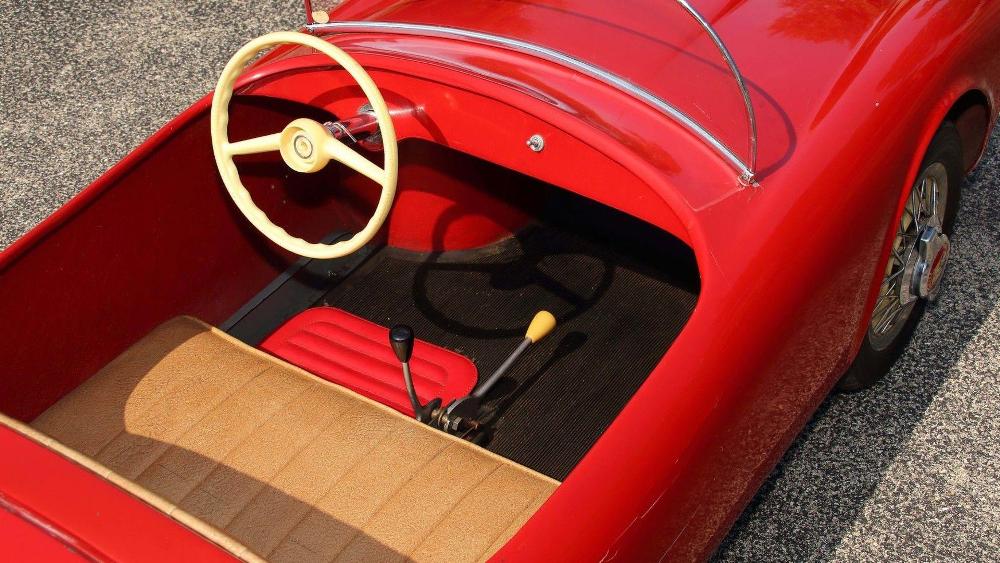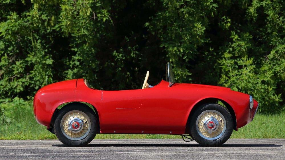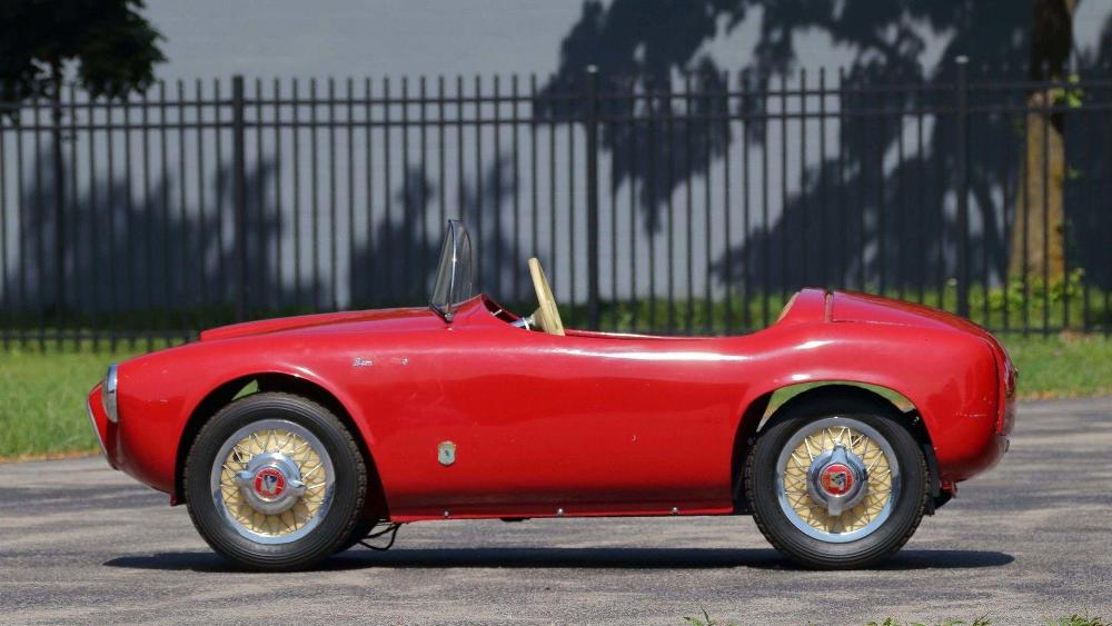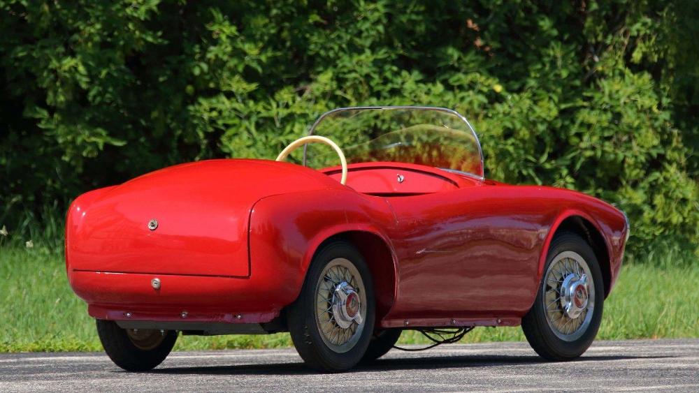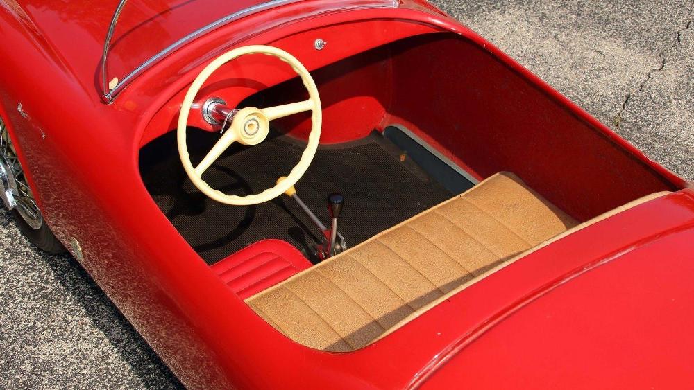 La segunda de estas espectaculares réplicas de coches para niños que saldrá a subasta es un ‘Baby Ferrari’ Bimbo Racer de 1956 que originalmente fue propiedad del hombre de negocios E.L. Cord. Fabricado a mano por S.I.L.A. en Turín (Italia), y diseñado por Giovanni MIchelotti, el coche está equipado originalmente con un motor eléctrico de 12V y sus respectivos controles, carrocería de fibra de vidrio con pintura roja correspondiente al período, neumáticos Pirelli y un interior de cuero. Su precio de venta oscila entre 20.000 y 30.000 dólares (entre 16.927 y 25.390 euros).